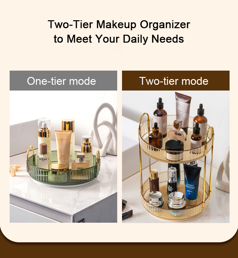 - Large Capacity: The 2-tier makeup organizer has two layers without partition and your cosmetics can be placed to meet your needs. It can also be used as a one-tier organizer. It can be used to hold items such as perfume, nail polish, lipstick, powder blusher, eye shadow, base makeup, makeup powder, nail beauty tools, facial cleanser and other toiletries while saving space.