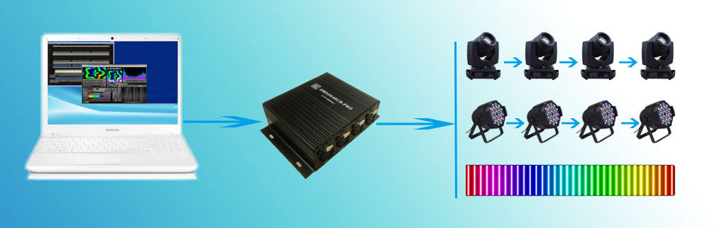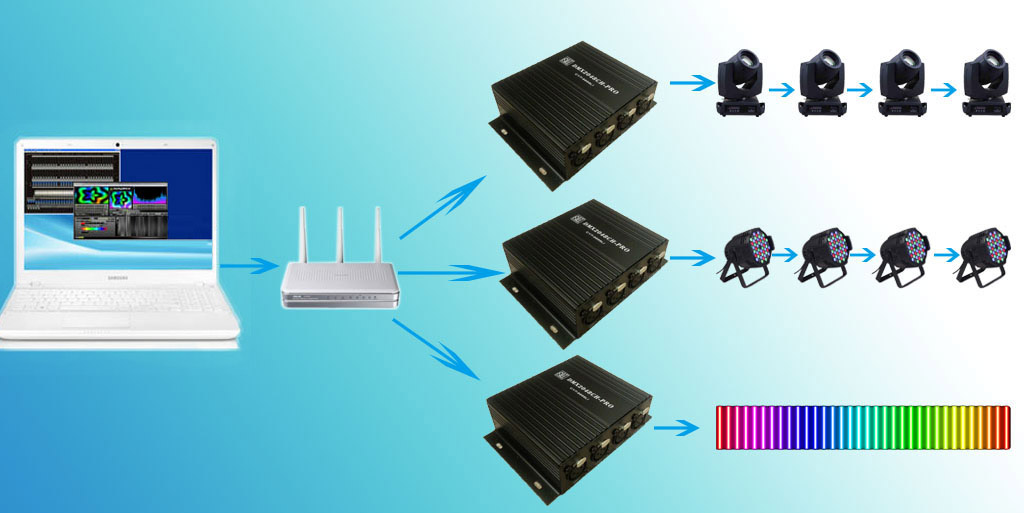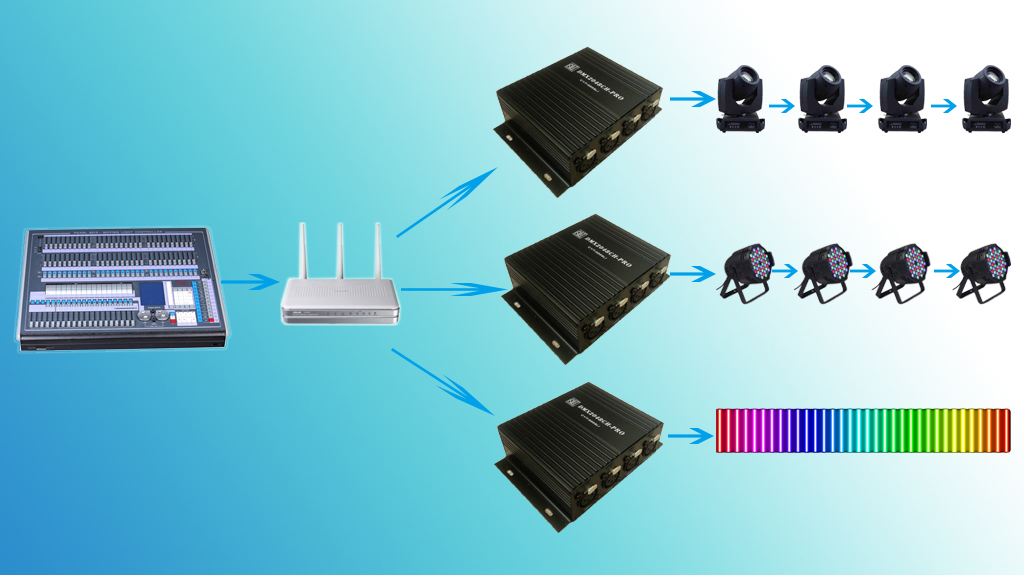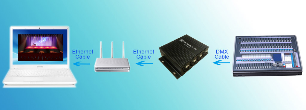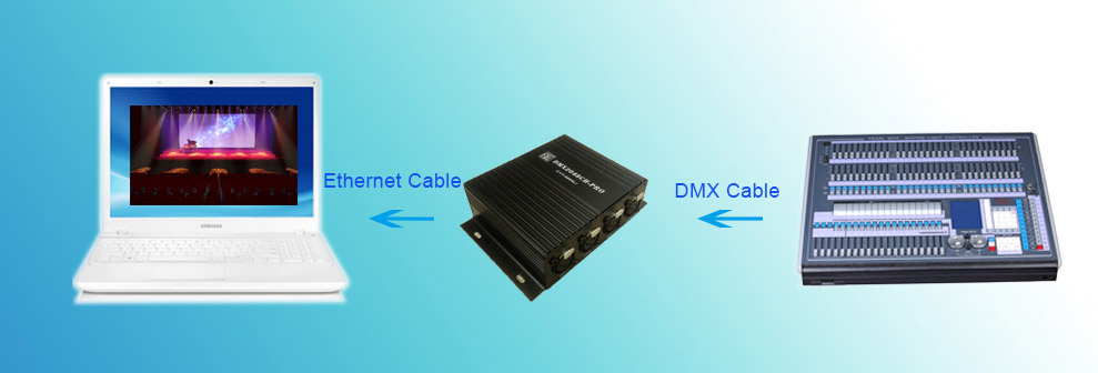 1. DMX512-ArtNet mainly packs DMX512 signal input from a physical console into network data, and then transmits it to a computer through the network. Computer software decodes and controls lighting equipment on a simulated stage to demonstrate stage effect.