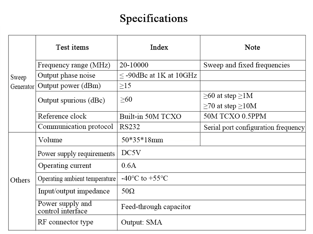 The fixed frequency signal generator is powered by 5V. It is small in size and low in power consumption. The 20M~10G broadband frequency source has a built-in high-performance 50M TCXO with a frequency stability of 0.5ppm. Its output phase noise is less than or equal to -90dBc at 1K at 10GHz. It can be used as a low-phase noise local oscillator signal for the system, or as a signal source for ultra-wideband. The module can be used directly as a system module or as a verification platform.