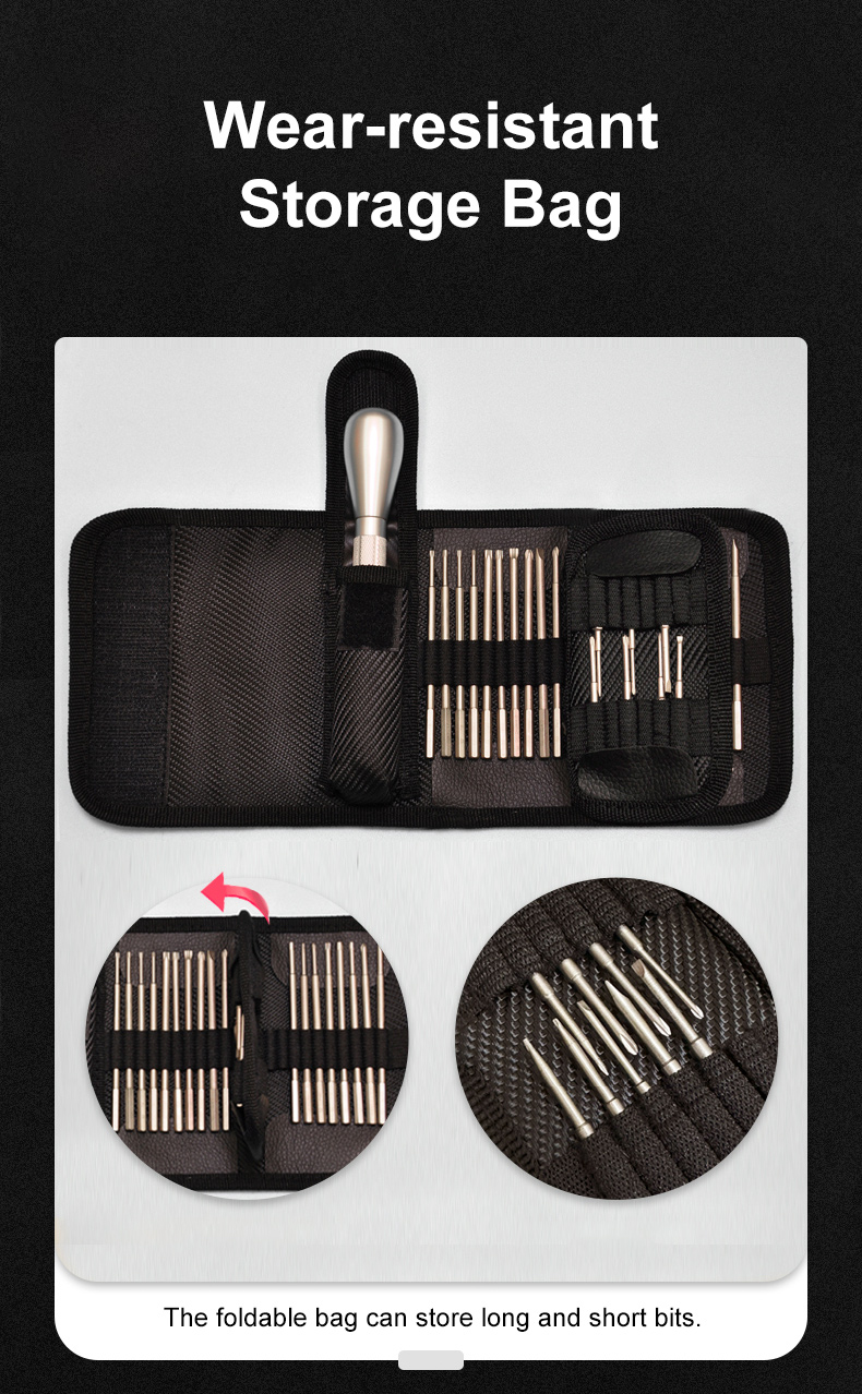 - Wear-resistant storage bag: The foldable bag can store long and short bits.