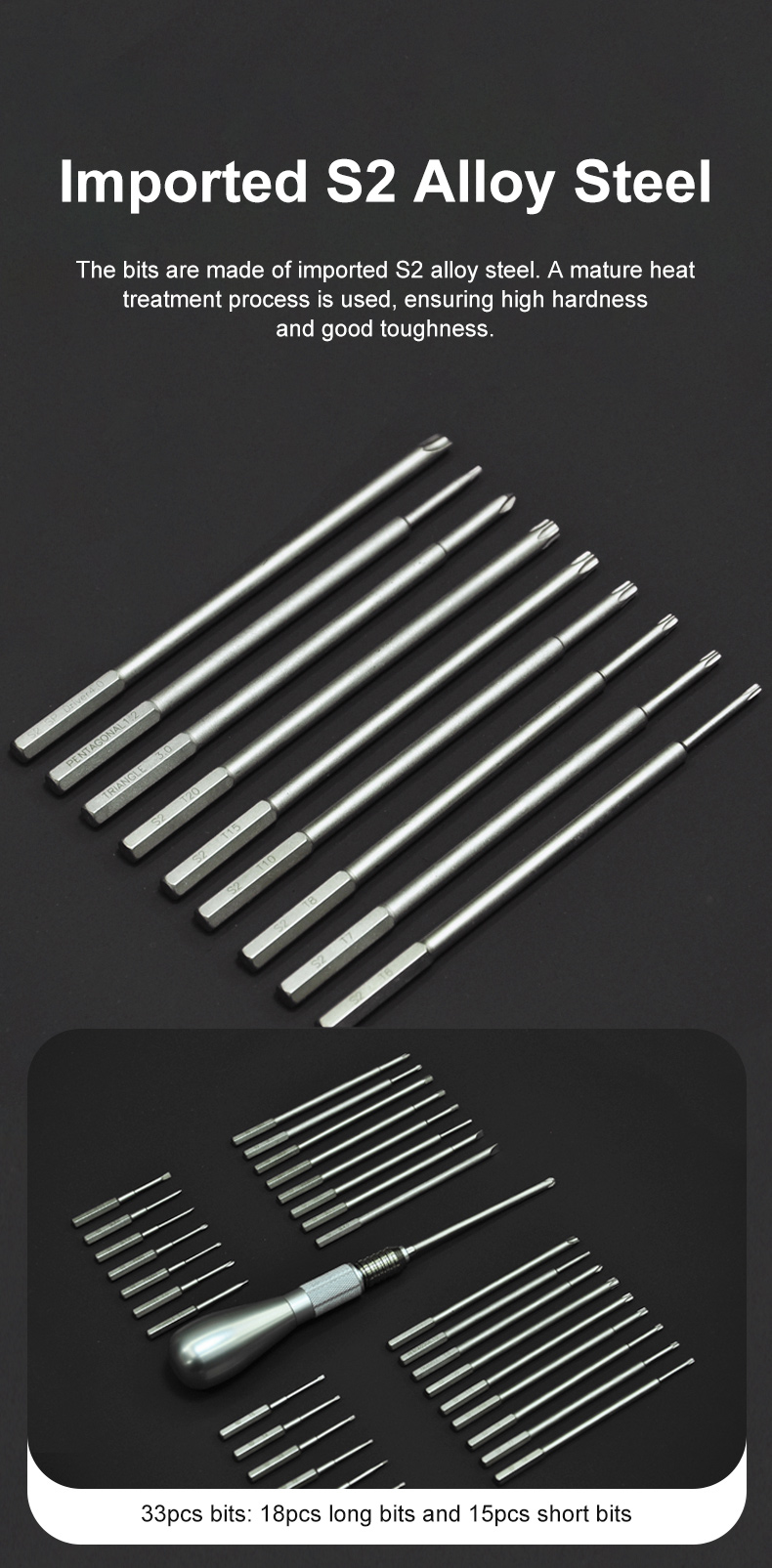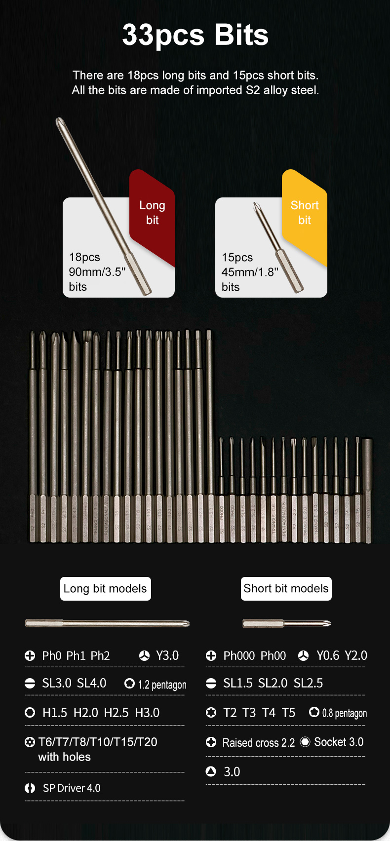 - 33pcs bits: 18pcs long bits are 90mm/3.5" in length and 15pcs short bits are 45mm/1.8" in length. All the bits are made of imported S2 alloy steel.
