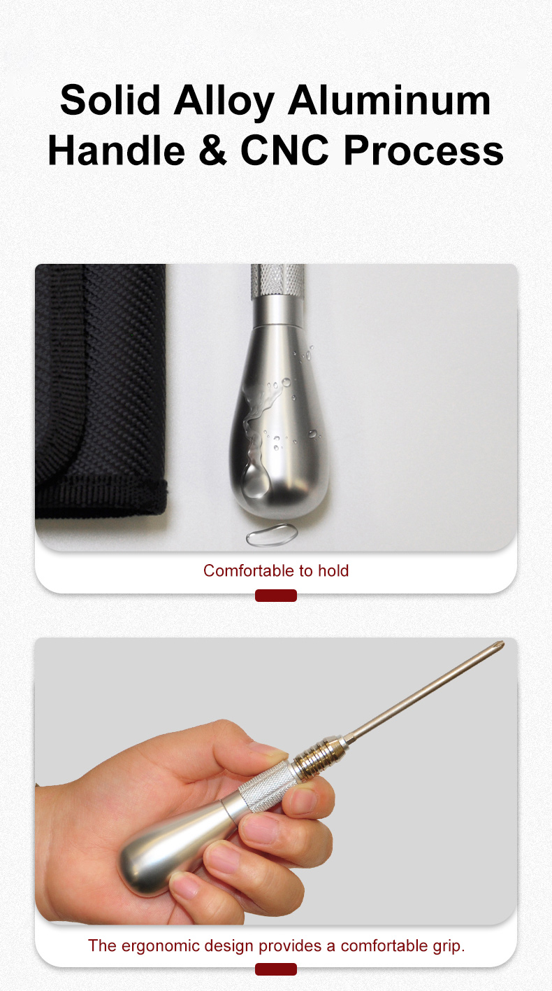 - Its handle is made of solid alloy aluminum, using CNC process. The ergonomic design provides a comfortable grip.