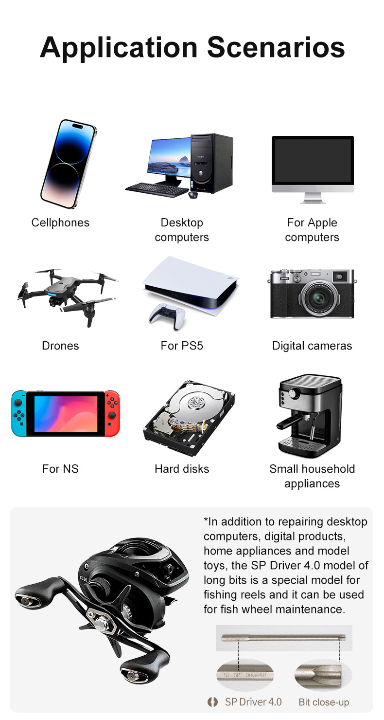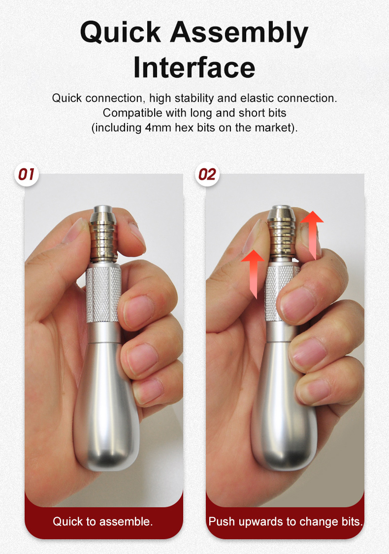 - Quick assembly interface: Quick connection, high stability and elastic connection. Compatible with long and short bits, including 4mm hex bits on the market.