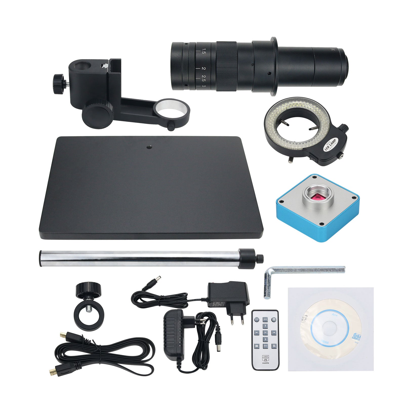 34MP 2K Industrial Microscope Camera Stand Kit w/ 180X C-Mount Lens 60 LED Ring Light For PCB Repair