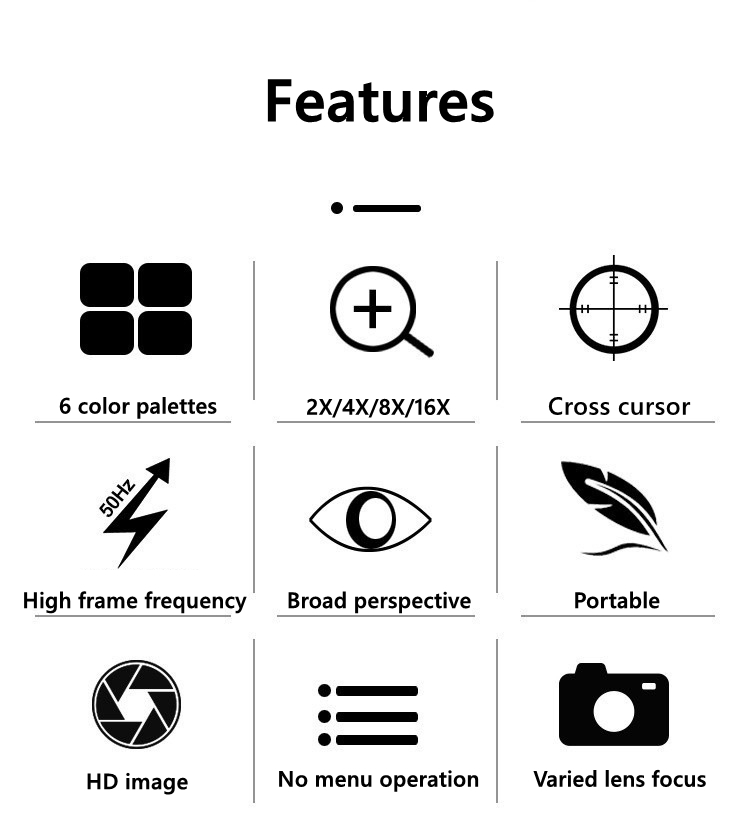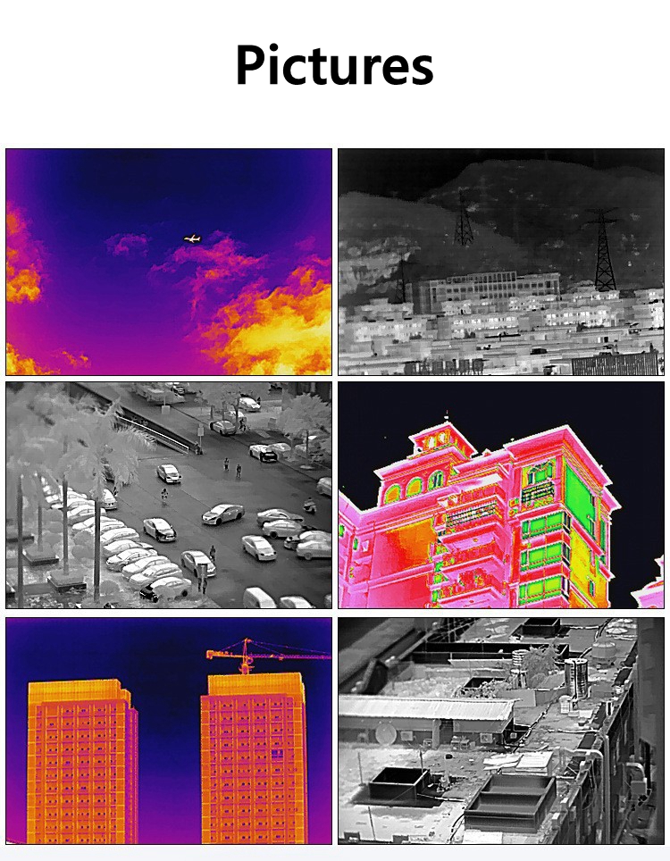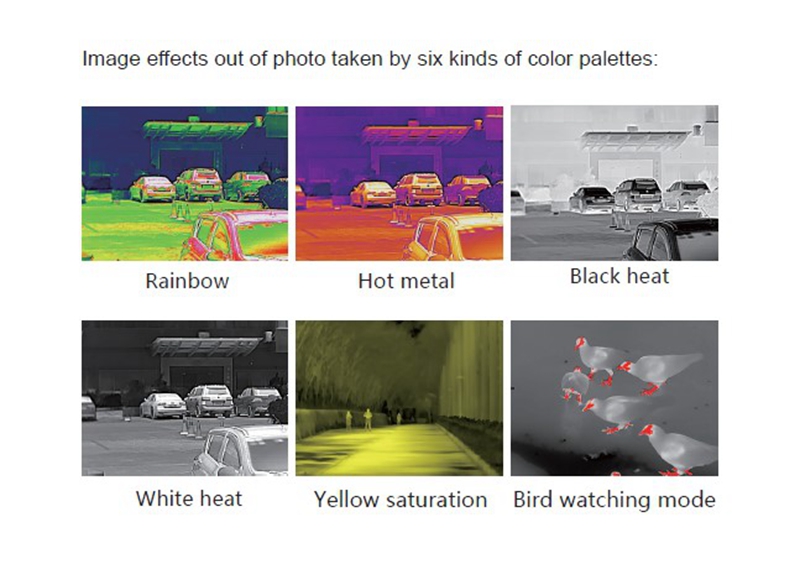 - Color palette: 6 categories of color palettes, rainbow, hot metal, white heat, black heat, yellow saturation, bird watching mode.