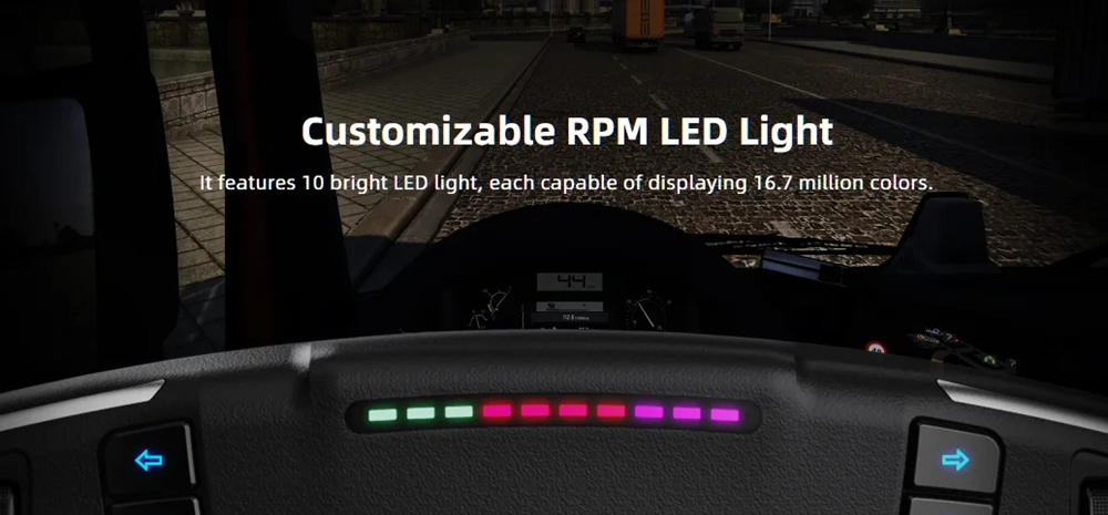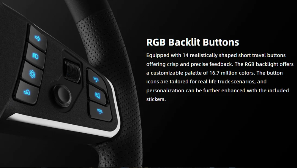 Equipped with 14 realistically shaped short travel buttons offering crisp and precise feedback. The RGB backlight offers a customizable palette of 16.7 million colors. The button icons are tailored for real life truck scenarios, and personalization can be further enhanced with the included stickers.