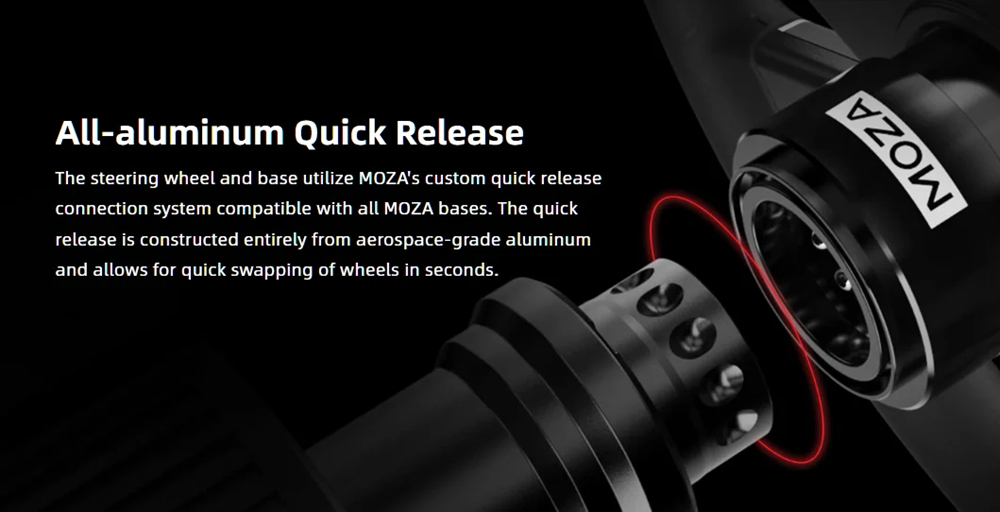 The steering wheel and base utilize MOZA's custom quick release connection system compatible with all MOZA bases. The quick release is constructed entirely from aerospace-grade aluminum and allows for quick swapping of wheels in seconds.