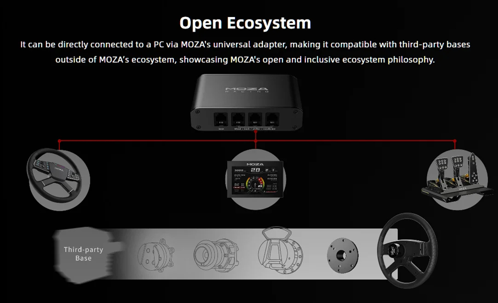 It can be directly connected to a PC via MOZA's universal adapter, making it compatible with third-party bases outside of MOZA's ecosystem, showcasing MOZA's open and inclusive ecosystem philosophy.