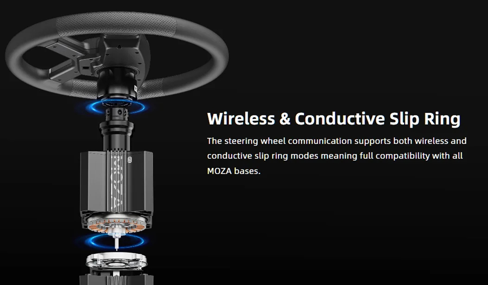 The steering wheel communication supports both wireless and conductive slip ring modes meaning full compatibility with all MOZA bases.