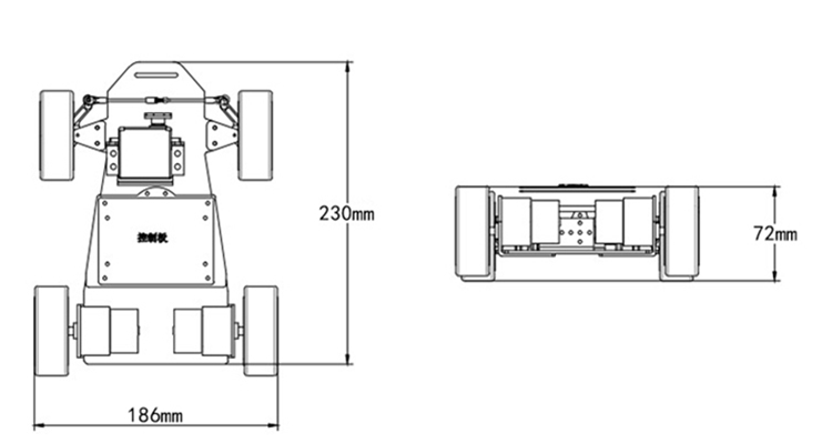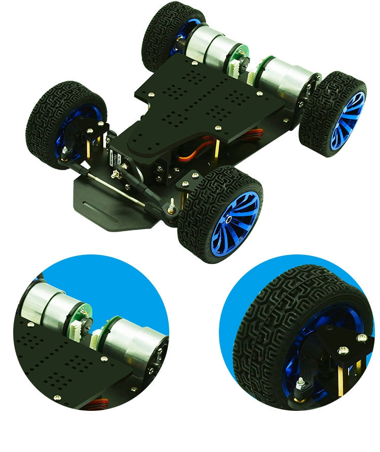 This is a newly designed 4-wheeled car chassis that is different from those with an ordinary 4-wheel drive. The car's rear-wheel drive plus front steering mechanism allows the car to move forwards, backwards and left and right.