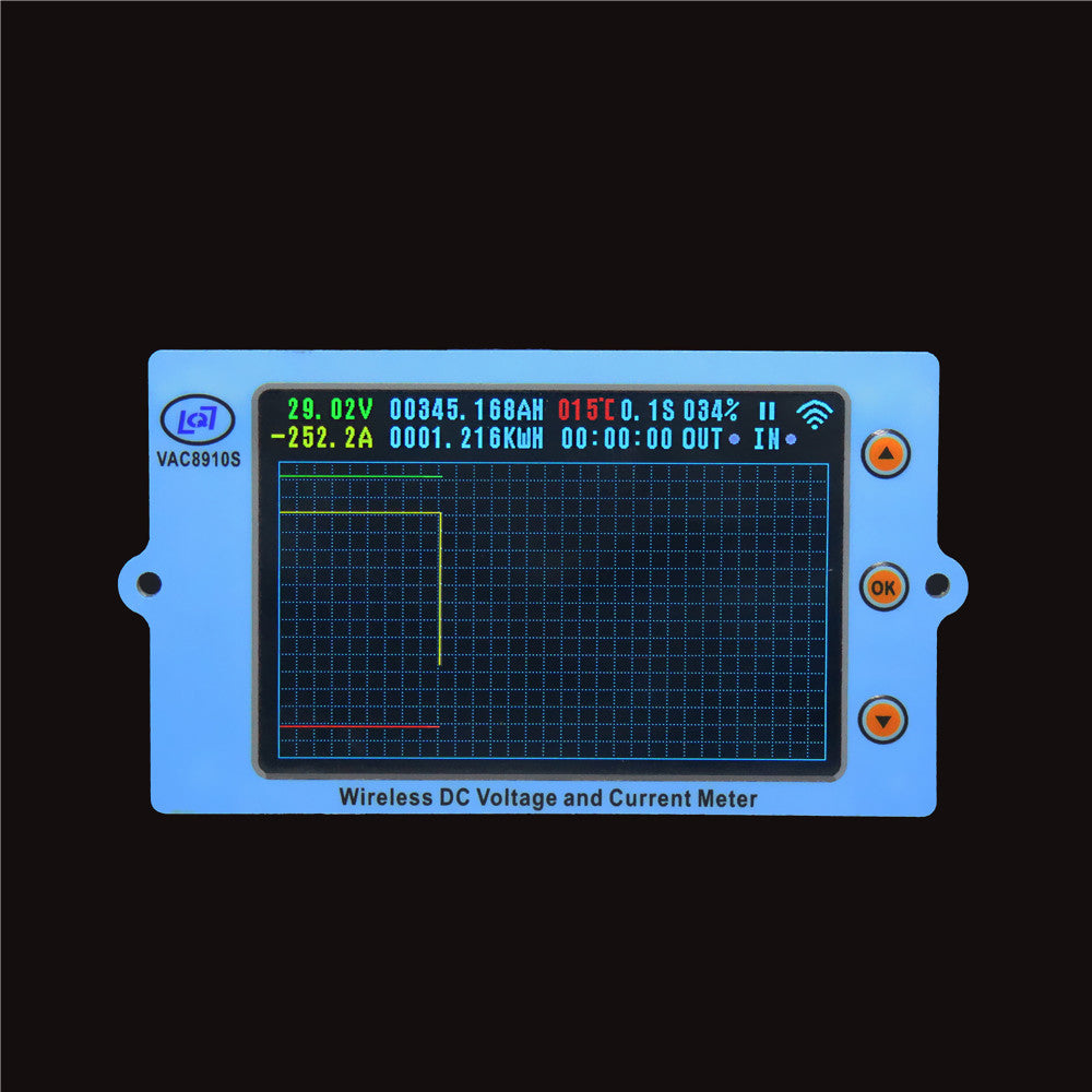 VAC8910F is a multi-function meter. It can display various physical parameters in real time, such as voltage, current, power capacity, energy, temperature, and operating time. Battery charging and discharging management, over-voltage, under-voltage, and over-current protection can be realized separately through its reserved two relay interfaces, accompanied by a buzzer alarm. And the instrument uses a 3.5-inch color LCD as a display. It displays data in a more comprehensive and clear fashion. The device has reserved communication interface for secondary development.