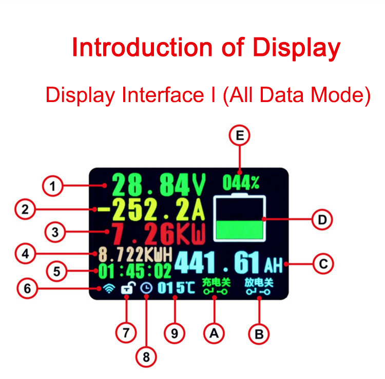 VAC8910F is a multi-function meter. It can display various physical parameters in real time, such as voltage, current, power capacity, energy, temperature, and operating time. Battery charging and discharging management, over-voltage, under-voltage, and over-current protection can be realized separately through its reserved two relay interfaces, accompanied by a buzzer alarm. And the instrument uses a 3.5-inch color LCD as a display. It displays data in a more comprehensive and clear fashion. The device has reserved communication interface for secondary development.