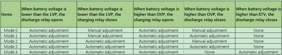 By selecting different modes, the charging and discharging relay can be manually opened and closed, or automatically opened and closed to realize automatic management of battery charging and discharging.