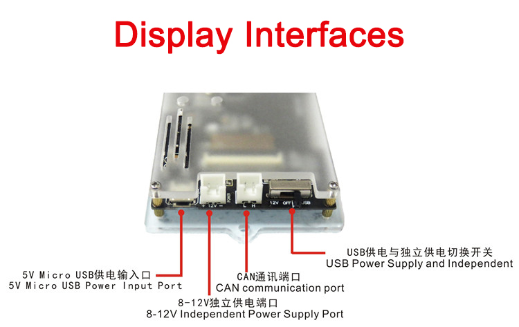 - Display power supply: USB power supply: 5V; independent power supply: 8-12V