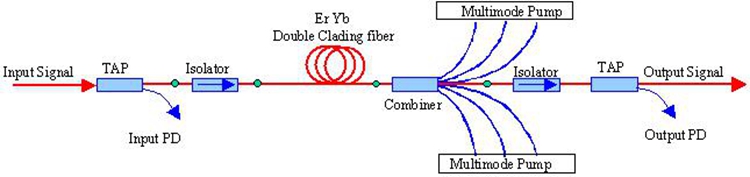 - This amplifier employ double cladding Erbium Ytterbium co-doped fiber, and employ the high power multimode pump, with a 10 times Conversion efficiency higher than the single mode general technology, and therefore have a lower relative cost and more compact size and lower power consumption, in particular, for FTTH or FTTB or other large distribution system applications.
