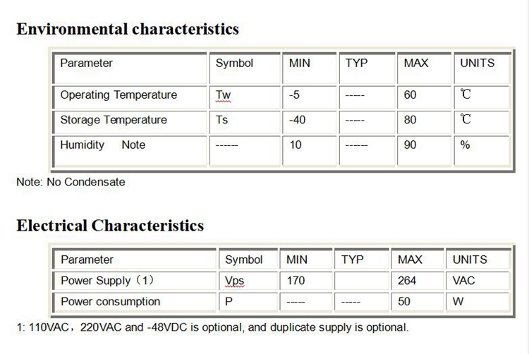 - Power supply: 86 - 265VAC or 48VDC (optional)