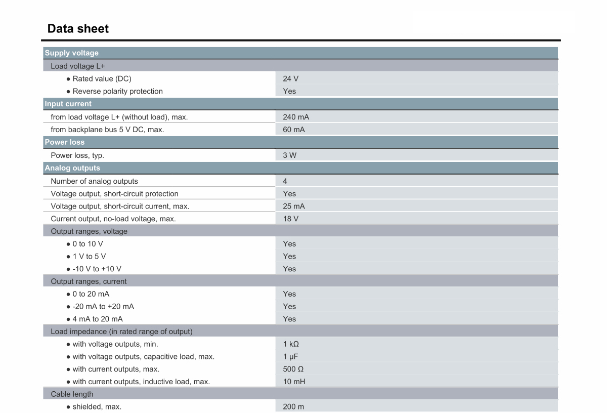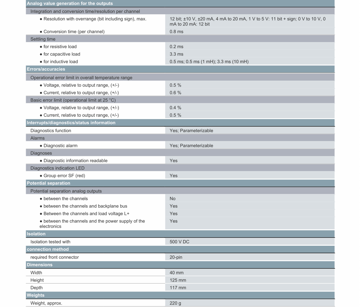S7-300 for SIMATIC, Analog output SM 332, isolated, 4 AO, U/I; diagnostics; resolution 11/12 bits, 20-pole, removing and inserting possible with active backplane bus.