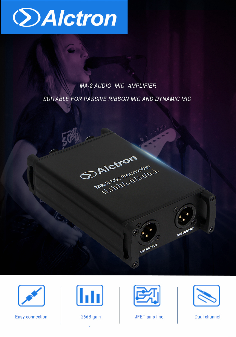 Alctron MA-2 Mic Preamplifier Mic Preamp for Dynamic & Passive Ribbon Microphones Dual Mic Input