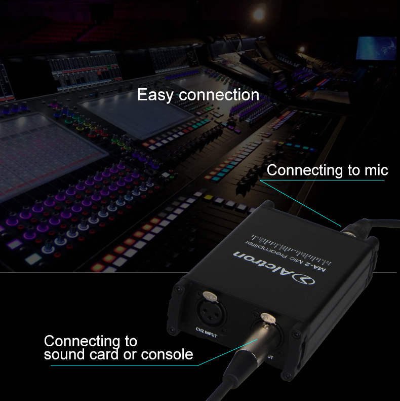 MA-2 is a professional microphone preamplifier that operates on 48V phantom power, but does not pass phantom power to microphones. This makes it ideal for ribbon and dynamic microphones. It is made by cold-rolled plate which is firm and durable. Four foam pads raise the resist falling capability of microphone in a way. Its black looking makes it classic and graceful. All in all, MA-2 is a better choice for you to use.