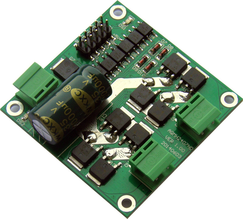 This H-bridge module uses a gate circuit and a combination of MOS transistors to achieve motor forward and reverse, braking and speed regulation control. It has both larger output current and flexible control signal logic similar to L298.