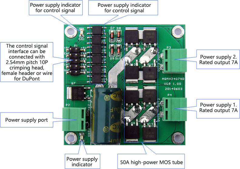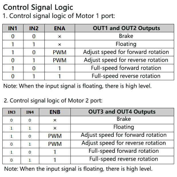 - Similar to L298 control logic, each channel supports three-wire control enable, forward and reverse rotation and braking