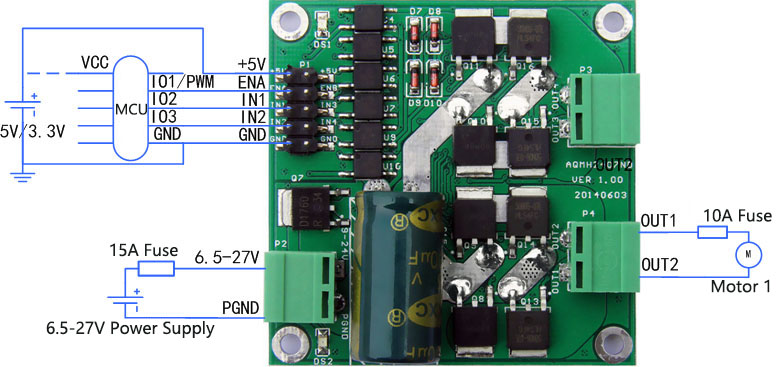 The MCU power supply and the driver board's control signal power supply should share the same ground, but not the same ground with the motor power supply PGND. When using a 5V MCU, the driver board +5V is connected to the power supply +5V. When using 3.3V MCU, the driver board +5V is connected to the power supply 3.3V. MCU and drive board control signals can share a power supply or independently supply power (but must share the same ground). ENA is connected to a GPIO or PWM output port of the MCU. When ENA is high, the drive board is enabled, forward and reverse or brake is effective. If it is a PWM signal, the motor can be adjusted; when it is low, drive The board is disabled, and the motor interface has no output. IN1 and IN2 are connected to the two GPIOs of MCU (supporting any IO port of 51 MCU, no pull-up resistor is needed), to control the forward and reverse rotation and braking of the motor, and the driver logic is shown in the table above.