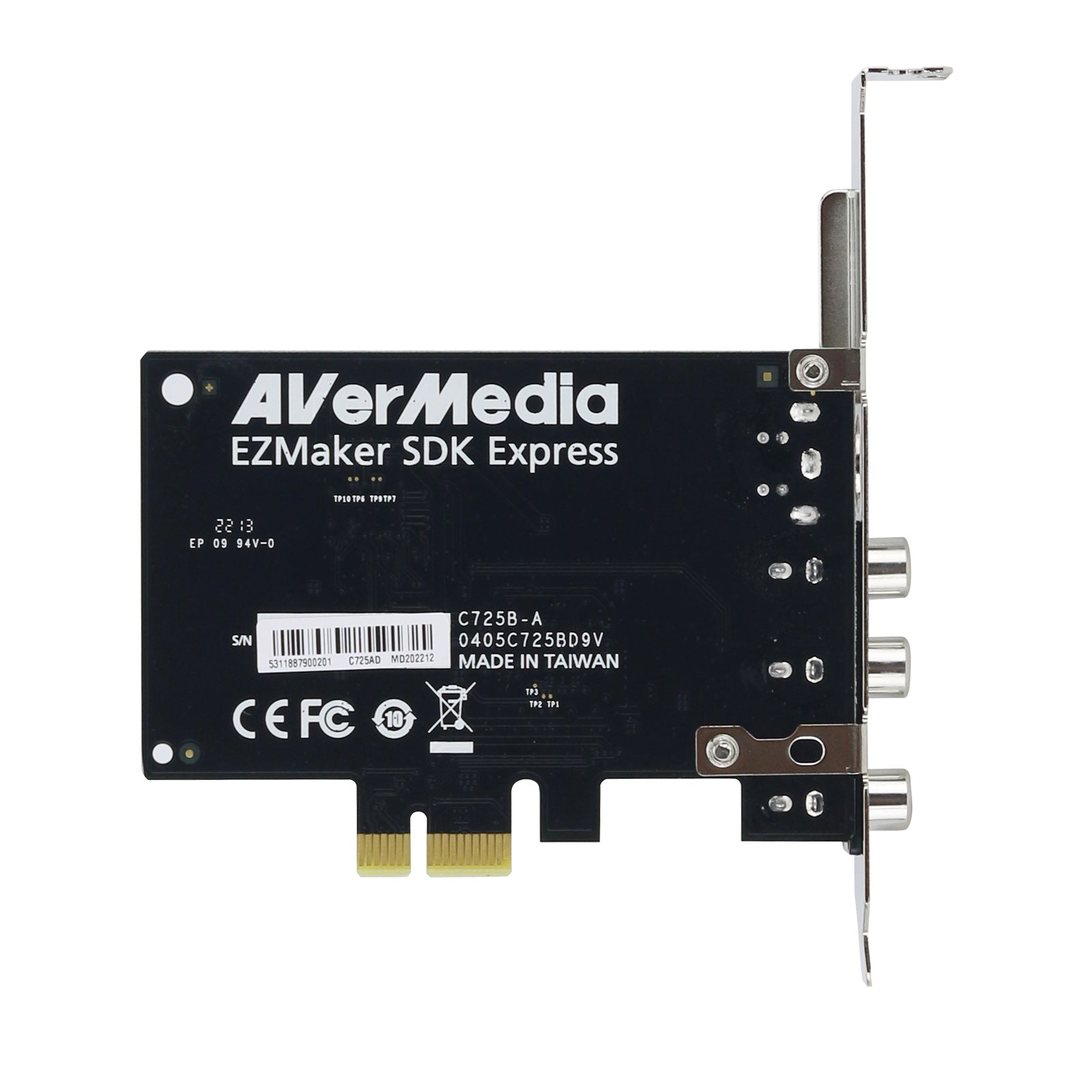 AVerMedia EZMaker SDK Express (C725B) is a PCI-E video card equipped with composite, s-video and stereo audio inputs for digitizing videos from analog signals into uncompressed AVI format at 25/30 fps in a wide range of resolutions. It supports PAL, NTSC and SECAM video standards, and also comes with a software development kit which includes frequently used applications for system developers to integrate apps in various operation platforms.