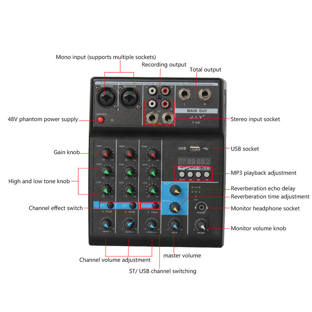 Bluetooth 4-way Tuning Table USB Audio DJ Mixer Perform Live Singing Recording Computer Phone Sound Card Reverberation DJ Device