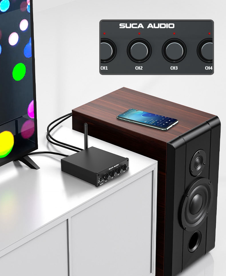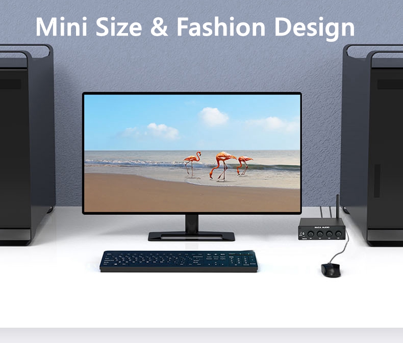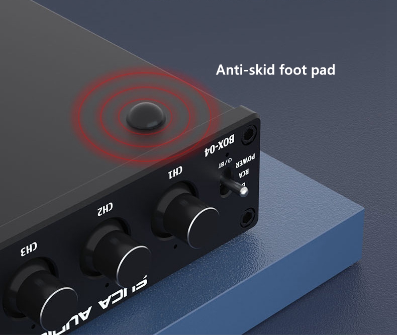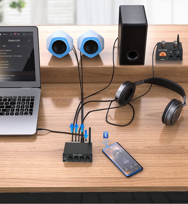 - Mobile phones, computers and other devices transmit signals through Bluetooth, 4 channels of 3.5mm audio are output synchronously, and the volume can be independently controlled to achieve low distortion, high amplification and restoration, which can easily solve the problems of insufficient output lines and noise in sound conversion.