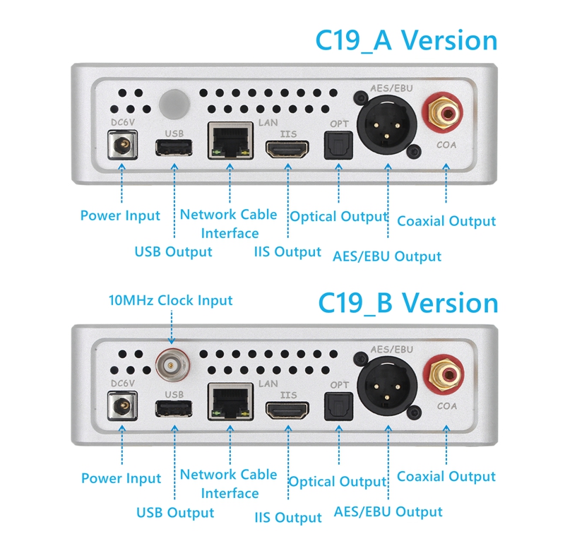 - C19 has a built-in audiophile-grade oven controlled crystal oscillator (OCXO), providing accurate clock signal for the whole machine. Through the intervention of 10M clock signal, the clarity and transparency of the sound are greatly improved, and the sound field is open and accurately positioned.