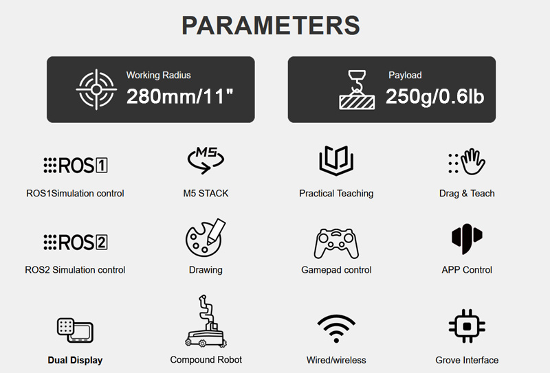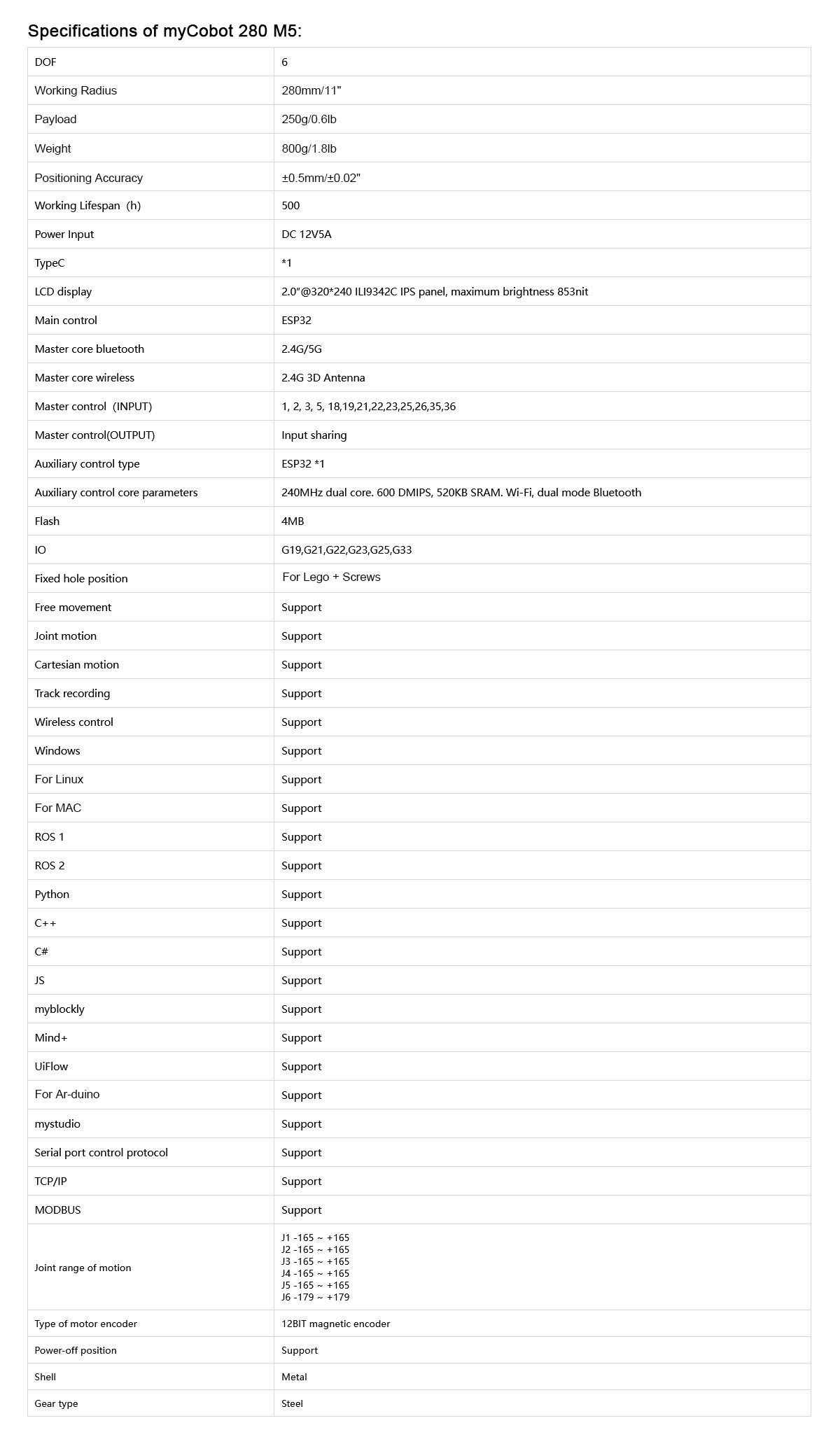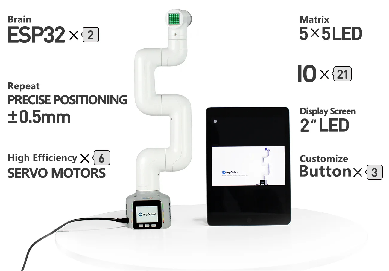 * The myCobot is based on the M5Stack platform, with easy programming and abundant online resources for thousands of use cases.