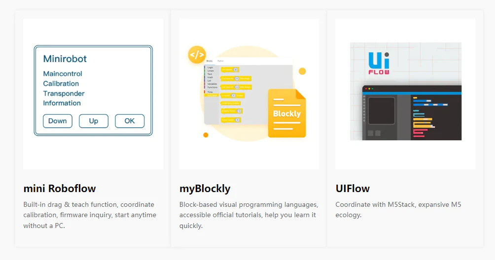 myBlockly, a drag-and-drop programming software, is offered for beginners. With block-based programming and graphical debugging tools, even novices can easily control a robotic arm. Python 2/3 development environment supports various development driver libraries like QT and pymycobot. It meets advanced development needs in robot control, image recognition, and front-end development.