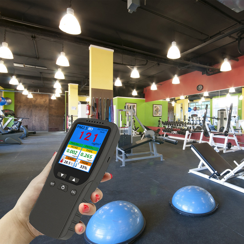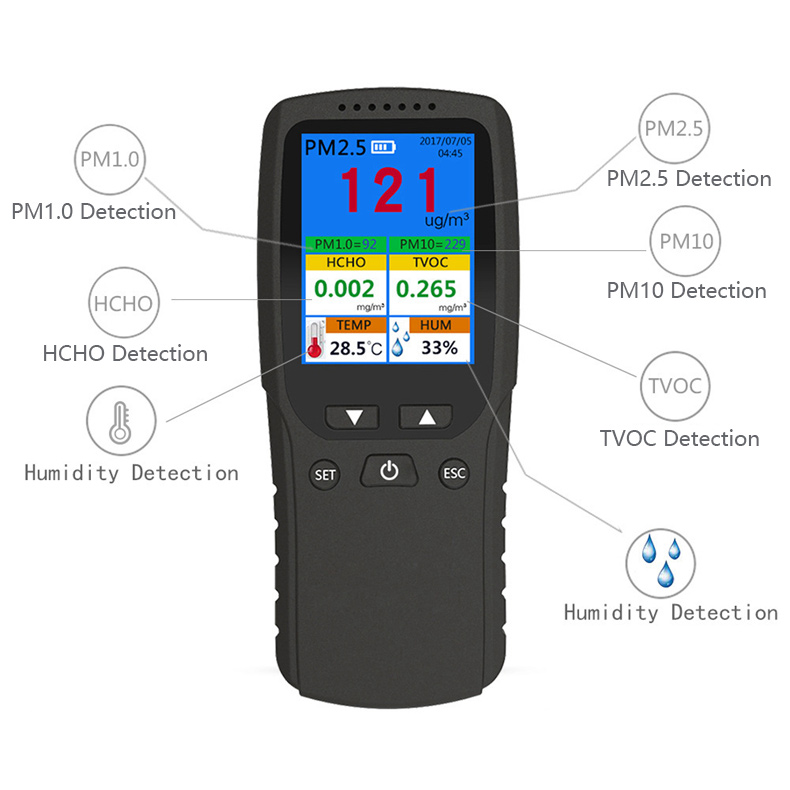 - Detection items: PM2.5, PM1.0, PM10, HCHO, TVOC, temperature, humidity and AQ