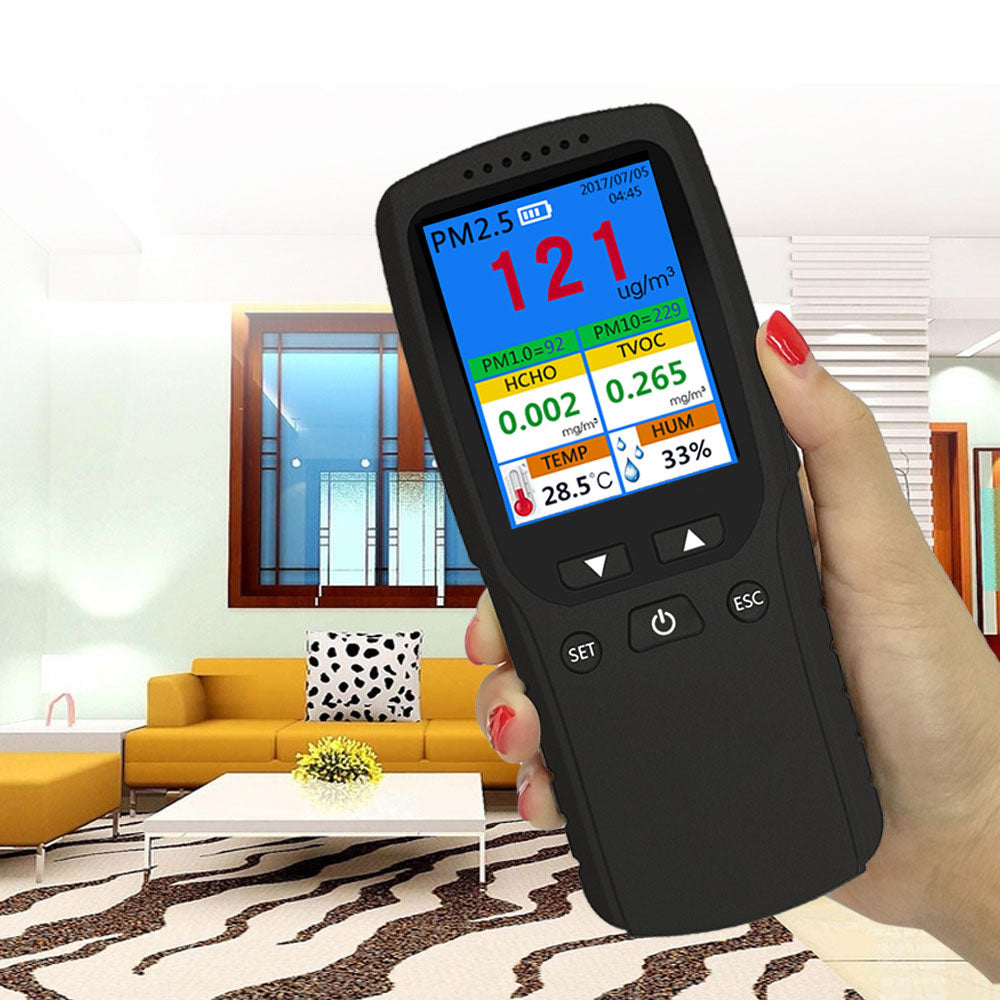 - It can test PM2.5, PM1.0, PM10, HCHO, TVOC, temperature, humidity and AQI