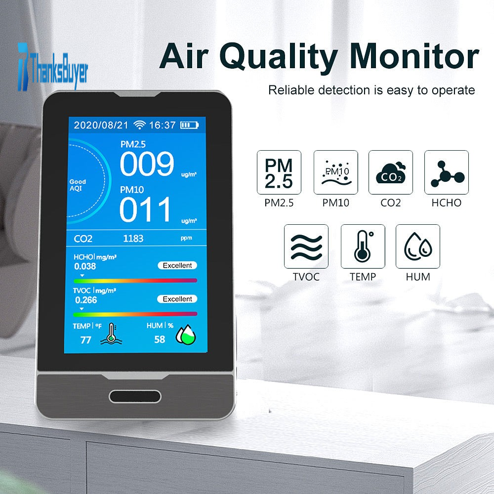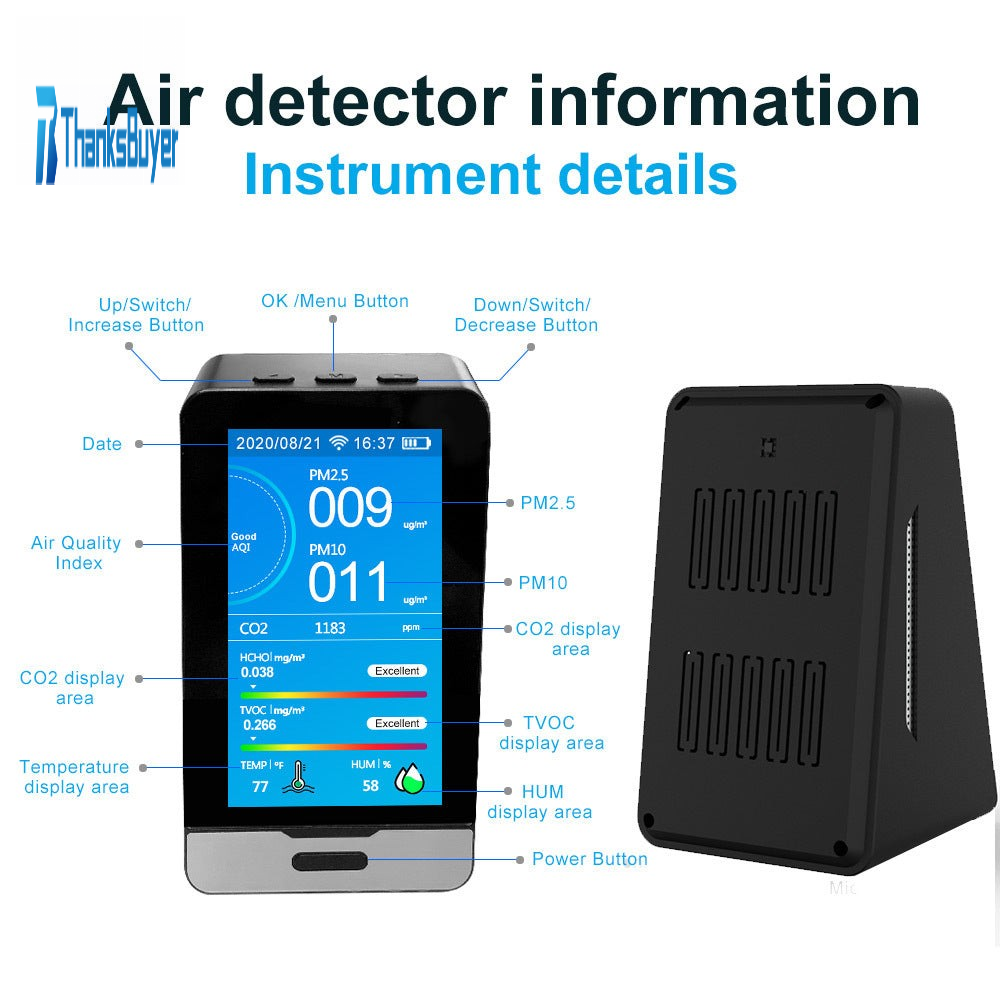 This product is a multifunctional air quality monitor that detects Carbon dioxide (CO2), Formaldehyde (HCHO), Total Volatile Organic Compounds (TVOC), Particulate Matter <2.5 micron-¬sized particles (PM2.5/1.0/10), Temperature, and Humidity with clock and record function. As a scientific air quality detection device, it combines multiple air sensors with a built-in fan to allow real time monitoring of Carbon dioxide (CO2), formaldehyde (HCHO), total volatile organic compounds (TVOC), PM2.5/1.0/10, temperature, and humidity on its digital LCD display.