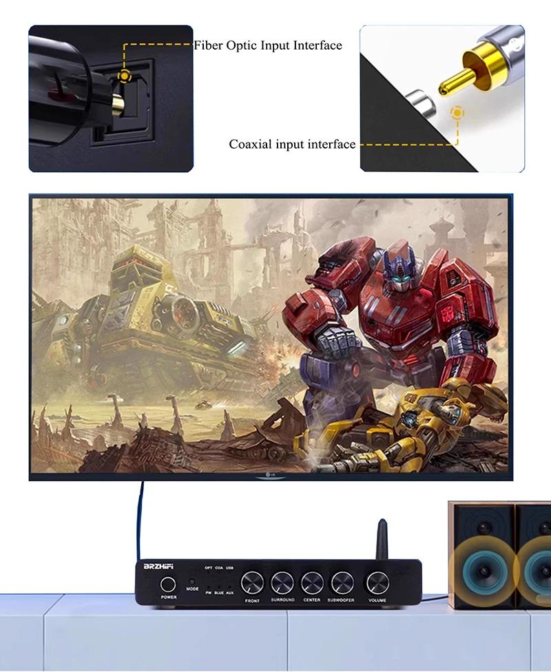 - Supports fiber optic/coaxial input for better digital audio transmission and more realistic scenes. Supports fiber optic/coaxial input connection for high-quality home sound effects.