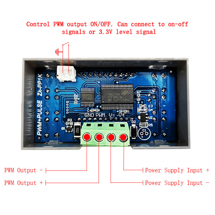 - Two Switchable Modes: PWM Mode: Frequency (continuous), duty cycle. Please note that the number of pulses cannot be set in this mode. Pulses are sent continuously in this mode. PULSE Mode: Positive pulse width time, negative pulse width time, delayed start time, and number of pulses are adjustable.