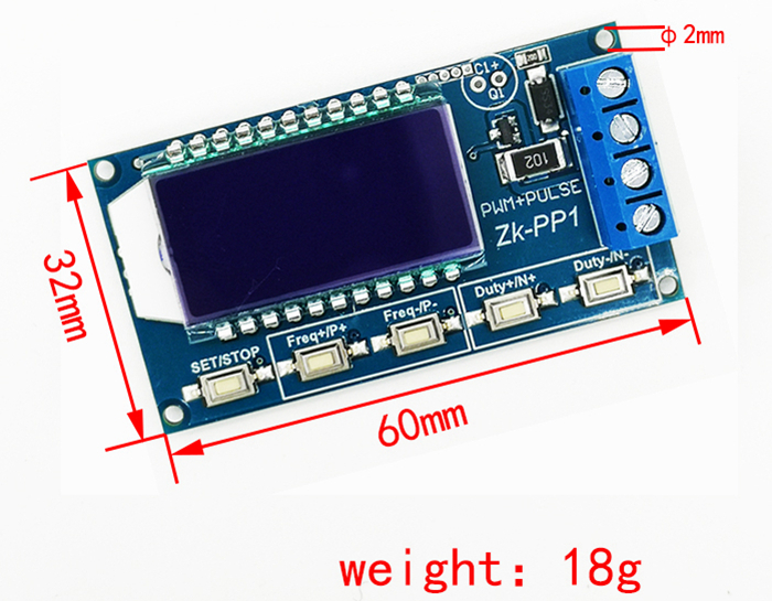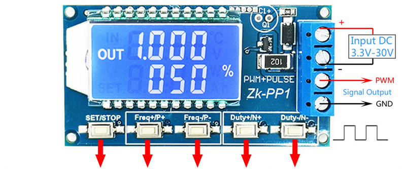 - Two Switchable Modes: PWM Mode: Frequency (continuous), duty cycle. Please note that the number of pulses cannot be set in this mode. Pulses are sent continuously in this mode. PULSE Mode: Positive pulse width time, negative pulse width time, delayed start time, and number of pulses are adjustable.