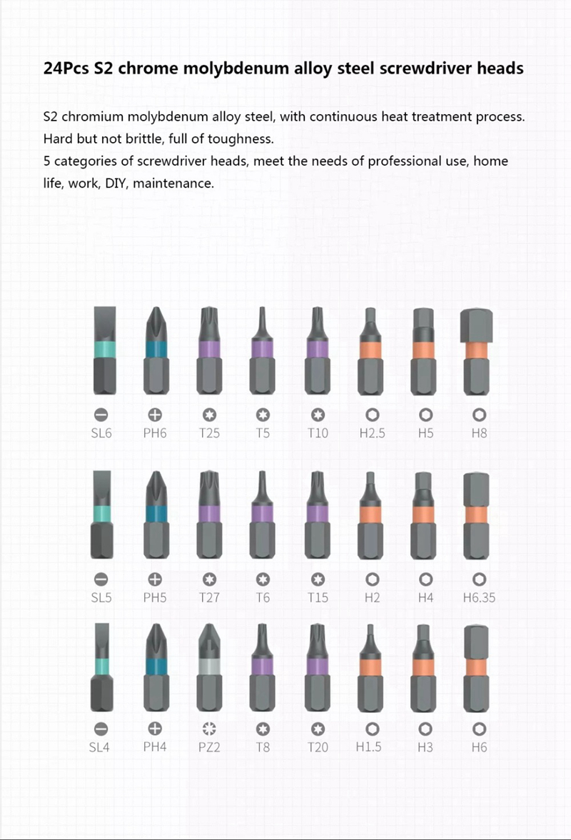 - 24Pcs Industrial grade S2 chrome molybdenum alloy steel screwdriver heads, with continuous heat treatment process. Assisted high precision CNC integrated molding, carburizing thermal refining, industrial grade service life, hard but not brittle, full of toughness