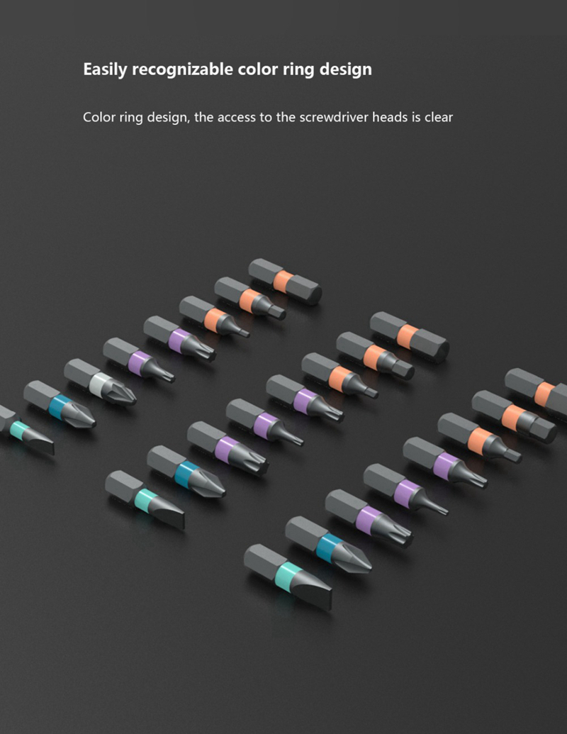 - Easily recognizable color ring design, the access to the screwdriver heads is clear