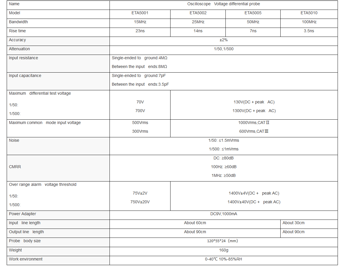 ETA oscilloscope differential probe is very suitable for power testing, switching power supply, inverters, motor drive control, switching power supply research and development, maintenance and evaluation.