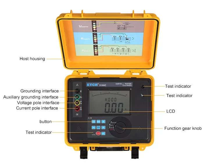 - Soil resistivity tester supports 2, 3 and 4‑wire grounding resistance measurement