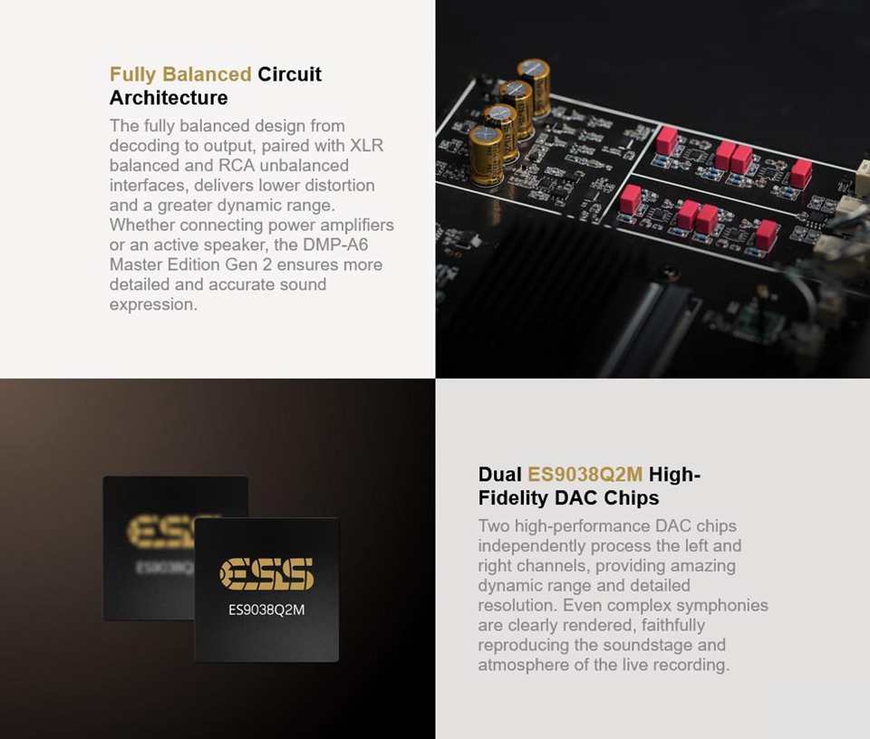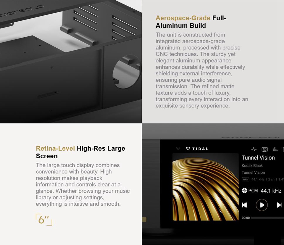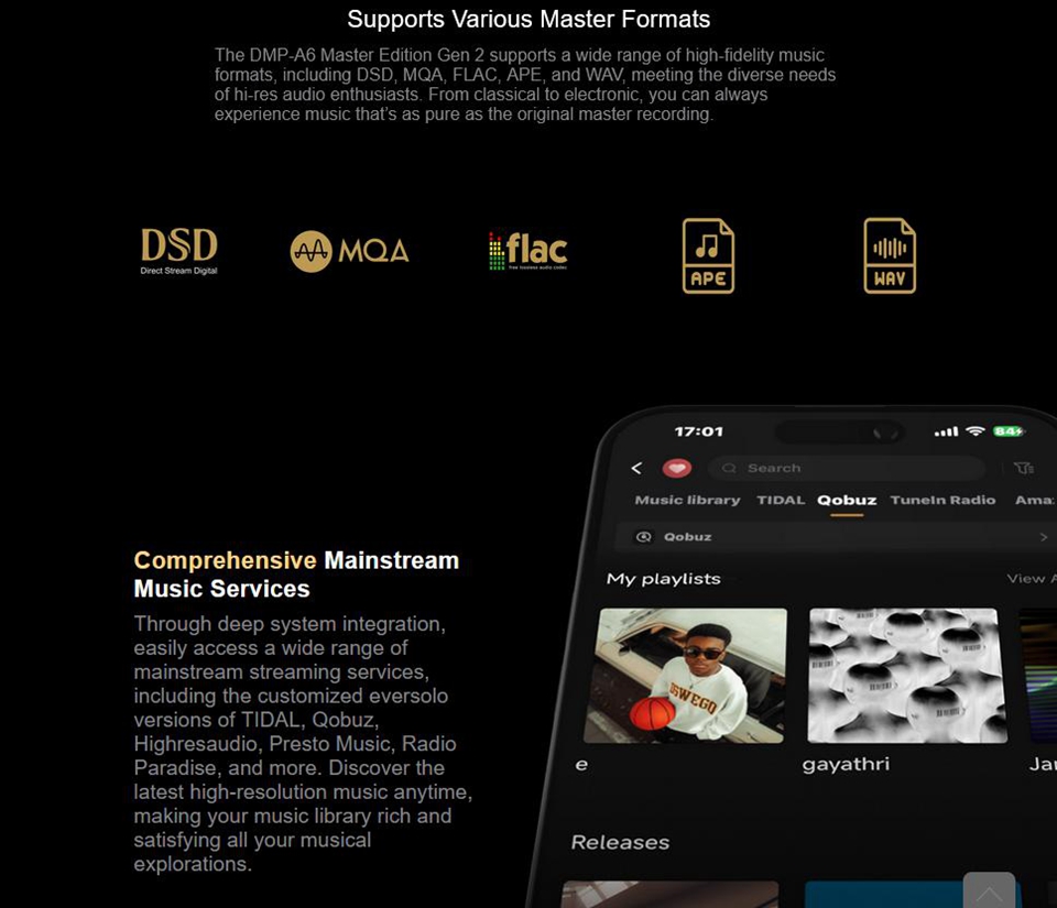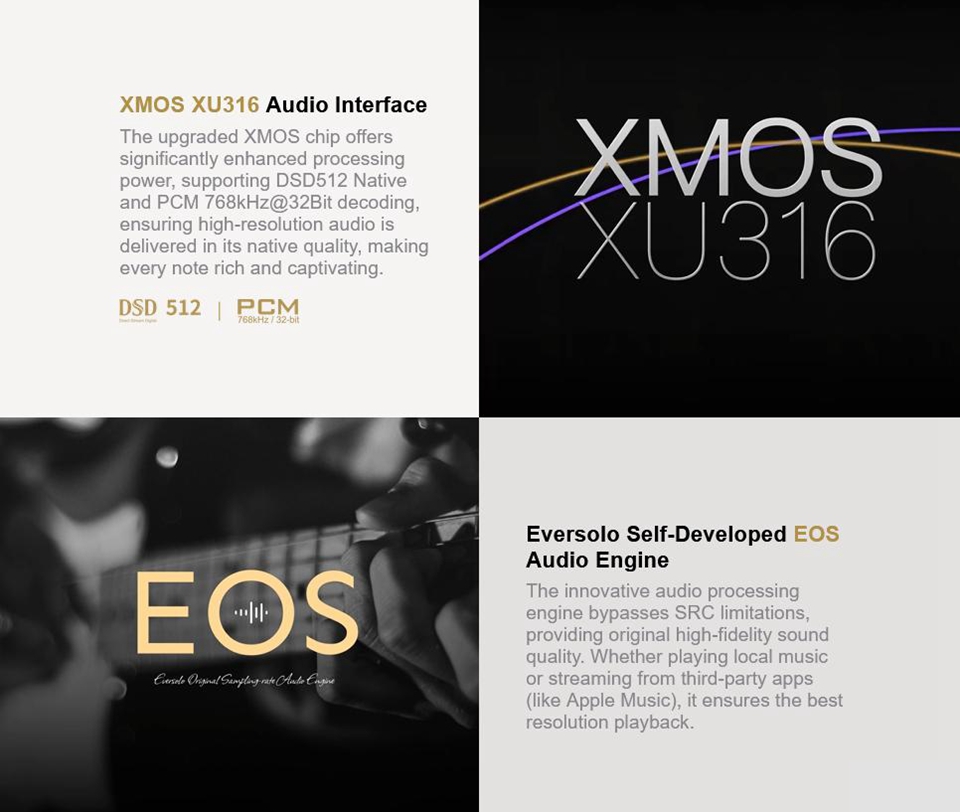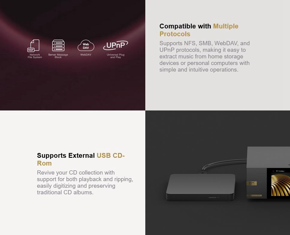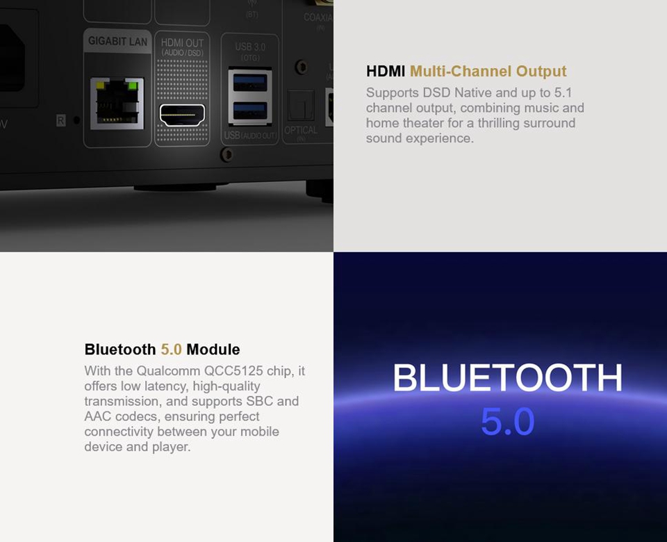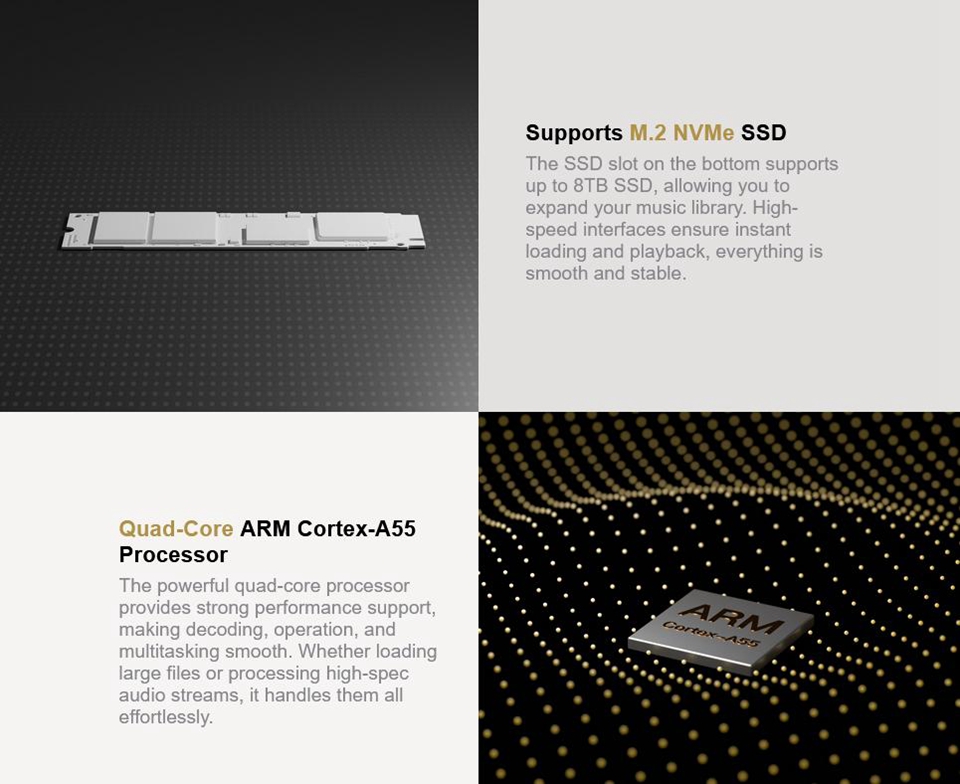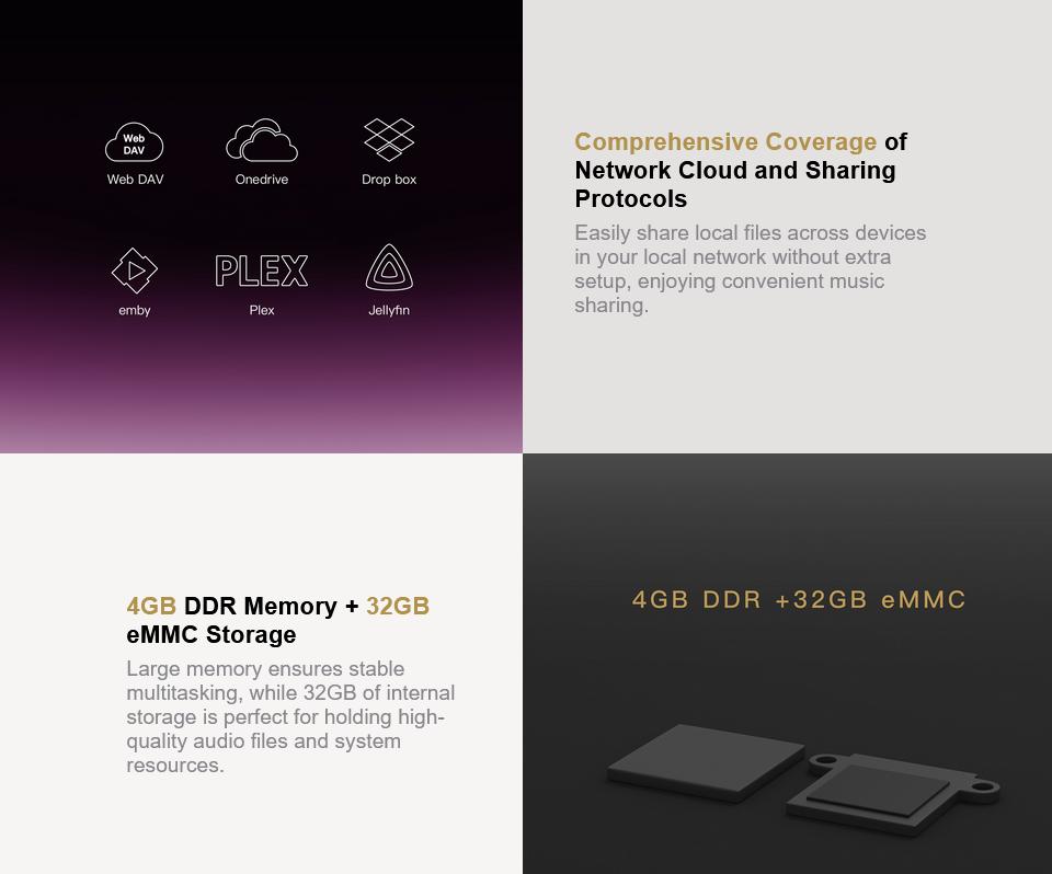 - Music playback and DAC decoding: supports up to Stereo DSD512, PCM 768kHz 32Bit, MQA format