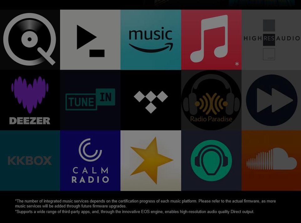 - Music services: for TIDAL, Qobuz, HIGHRESAUDIO, Amazon Music, IDAGIO, Calm Radio, Internet Radio, TuneIn, Radio Paradise, Deezer, SoundCloud, Presto Music, Apple Music*...