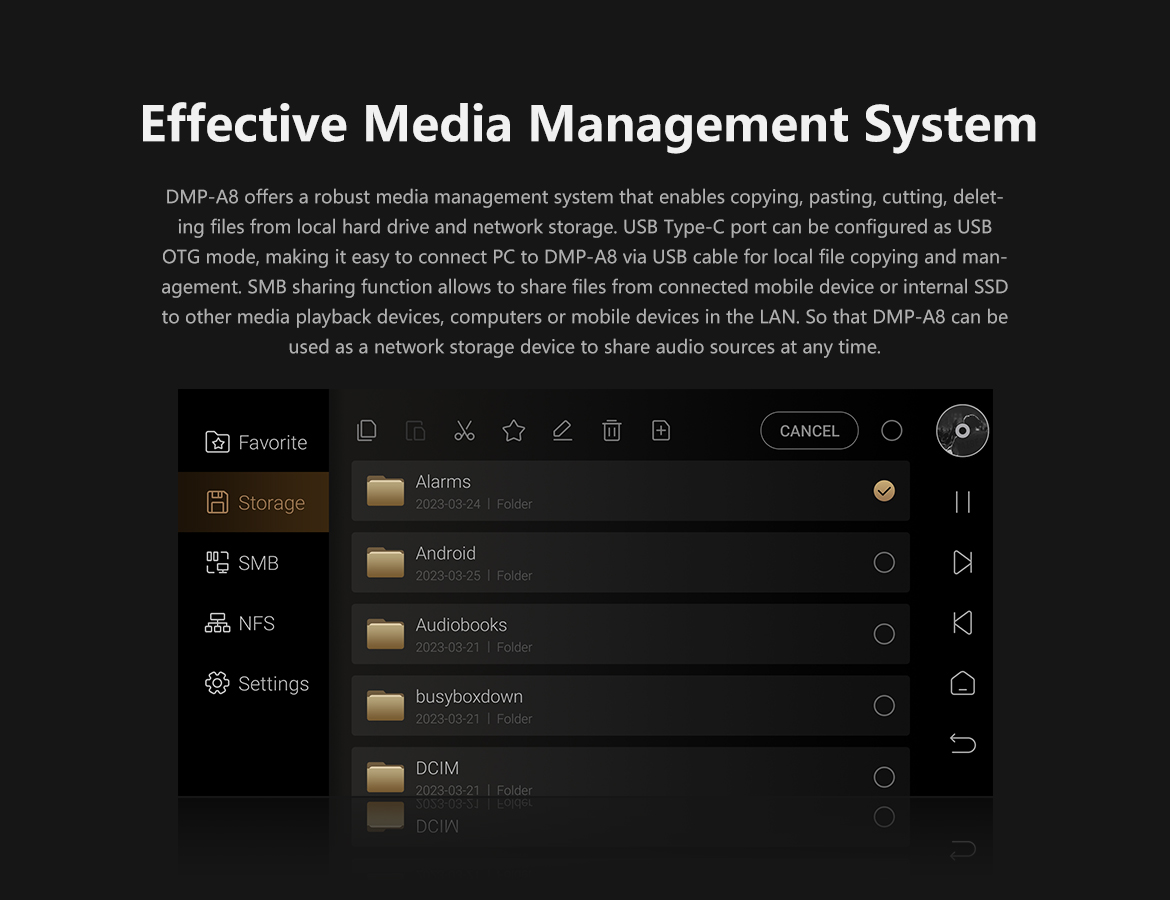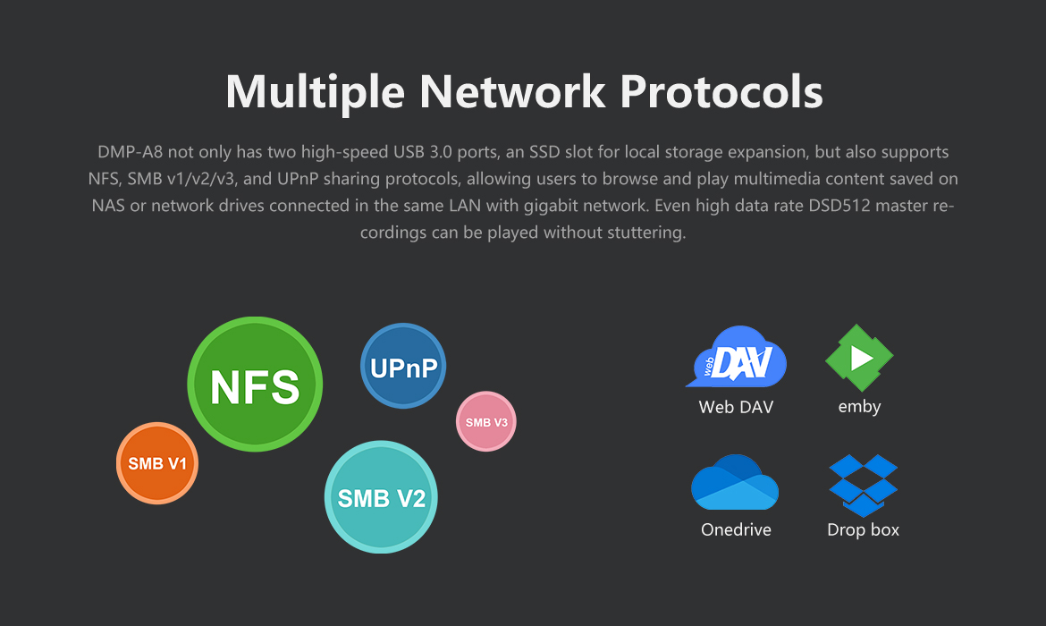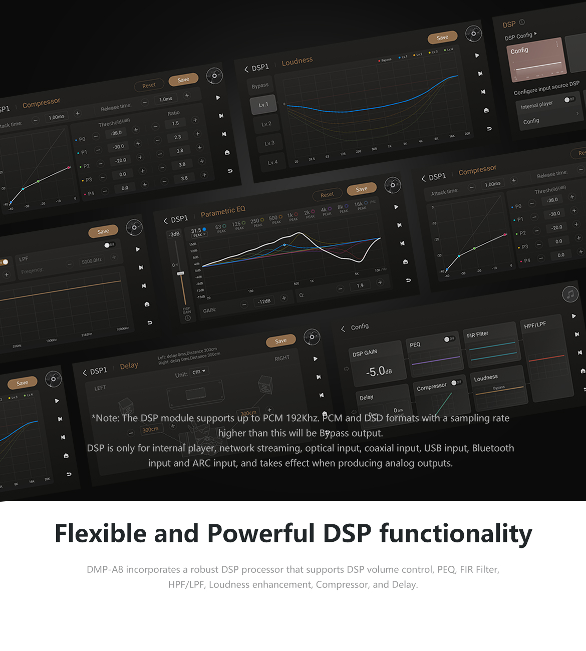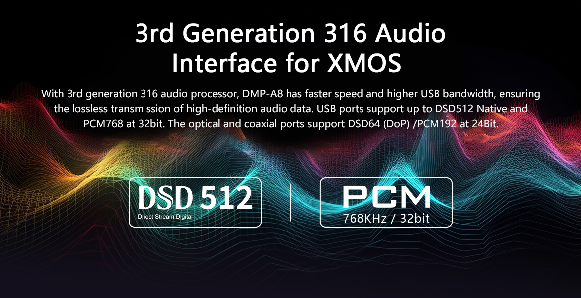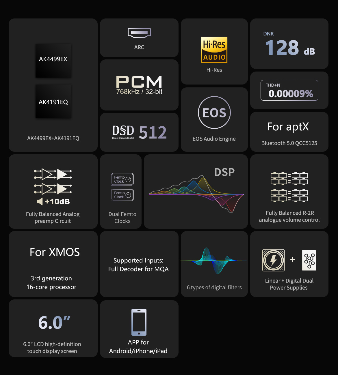 - Playback and DAC Decoding: Support up to stereo DSD512, PCM 768KHz 32Bit