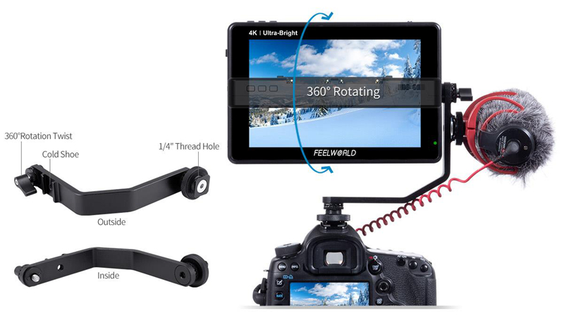The standard sized mounting points make it easy to mount and are compatible with third party rigging equipment. There are 3 mounting points located on the bottom, left and right. Using the bottom 1⁄4 inch hole, you can securely attach it to the top of your camera as the ultimate viewfinder! The 1⁄4-inch holes on the left and right sides can be mounted on other equipment with magic arm, bracket, etc., for the entire crew to monitor the screen.