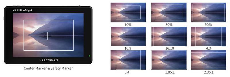 There are a variety of ratio marker (16:9, 16:10, 4:3, 1.85:1, 2.35:1); the transparency of the ratio marker has 4 display effects optional (0%, 25%, 50%, 75%). You can switch the marker colors between yellow, red, green, blue, white and black according to different tone of the subject.