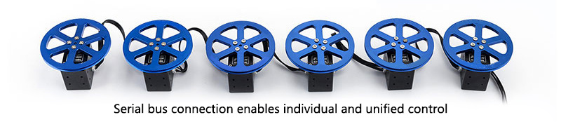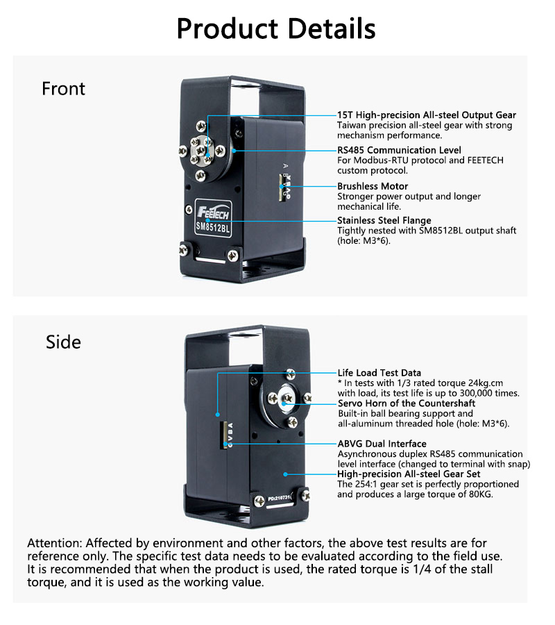 - 12V/24V brushless intelligent micro servo motor of high torque: reduction gear + brushless motor + high-precision 12-bit magnetic encoder sensor + FEETECH control board + RS485 communication. New concept power execution module is developed based on high reliability, scalability and basic functions.