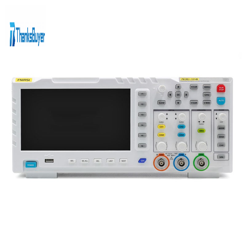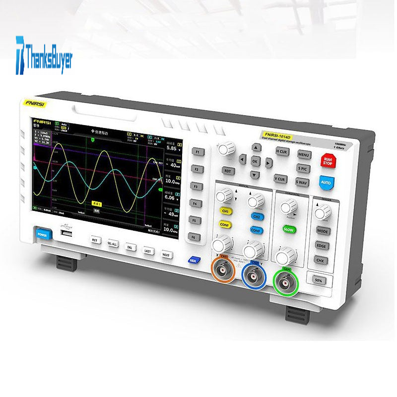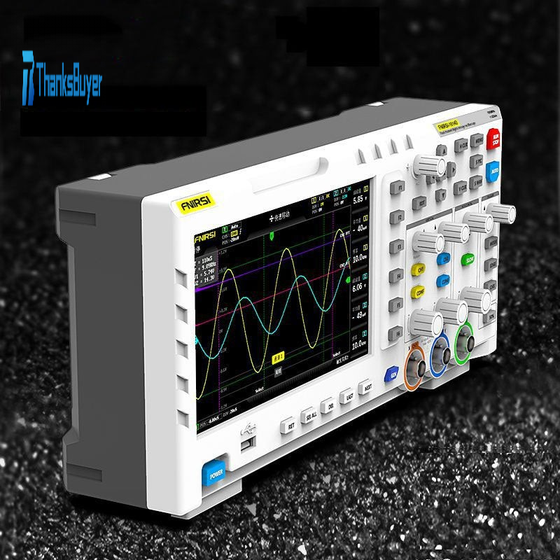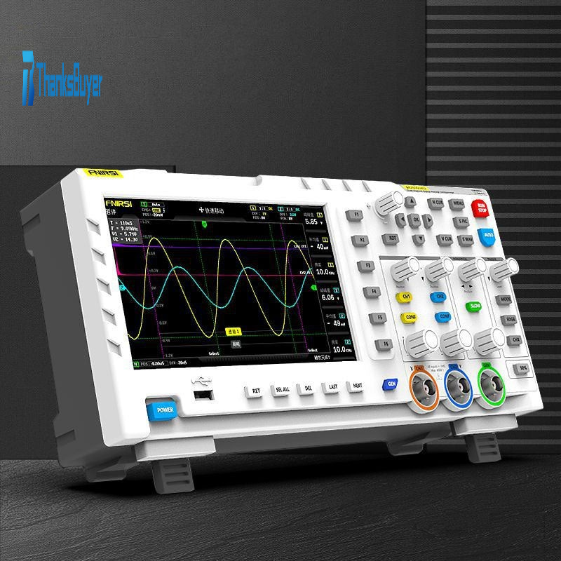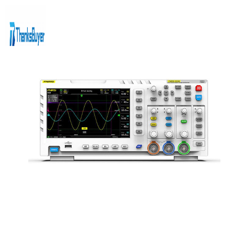 FNIRSI-1014D is a two in one oscilloscope and signal generator. It has comprehensive functions and high practicability. It is a cost-effective dual channel desktop oscilloscope for the maintenance industry and R & D industry. The oscilloscope has a real-time sampling rate of 1GSa/s and 100MHz*2 analog bandwidth; complete trigger function (single time/normal/automatic), both for periodic analog signal and aperiodic digital signal can be used freely; built in DDS function signal generator and the industry's original chopping output (at 2.5vpp), all signal frequency step is 1Hz, support 14 kinds of standard function signal and a customizable chopping signal, chopping. The output device intercepts part or the whole part of the complex signals measured by the oscilloscope as the output signal of the signal generator, which can store up to 1000 customized cut-off signals; the built-in high-voltage protection module can tolerate up to 400V continuous voltage, without worrying about the oscilloscope burning accident caused by the probe not moving to 10x gear. Large time base scrolling mode, which can monitor slow level changes; equipped with efficient one automatic button, which can display the measured waveform without tedious adjustment; display high-definition LCD with 7-inch 800*480 resolution; cursor measurement function, when manually reading amplitude and frequency parameters, it does not need to read the background scale unit and quantity, and it does not need to convert to directly get peak to peak and frequency. Extremely convenient screen collection and waveform storage function, built-in 1GB storage space, can store up to 1000 screen collected pictures + 1000 groups of waveform data, the storage process is simple and fast, save the current waveform with only one click, no cumbersome prompts and choices to save the current data, very convenient; powerful waveform image manager, support thumbnail browsing, view, view details The functions of page turning, deleting and waveform enlarging, reducing and moving are convenient for secondary analysis. The fuselage is equipped with USB interface, which can be connected with the computer to realize the sharing of its own screen collected pictures and the computer, which is convenient for secondary analysis; graphic display function can be used to compare and judge the amplitude, frequency and phase of two groups of signals; FFT viewing function can estimate the harmonic component of signals; graphic display function can be used to compare and judge the amplitude, frequency and phase of two groups of signals.