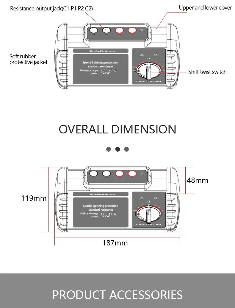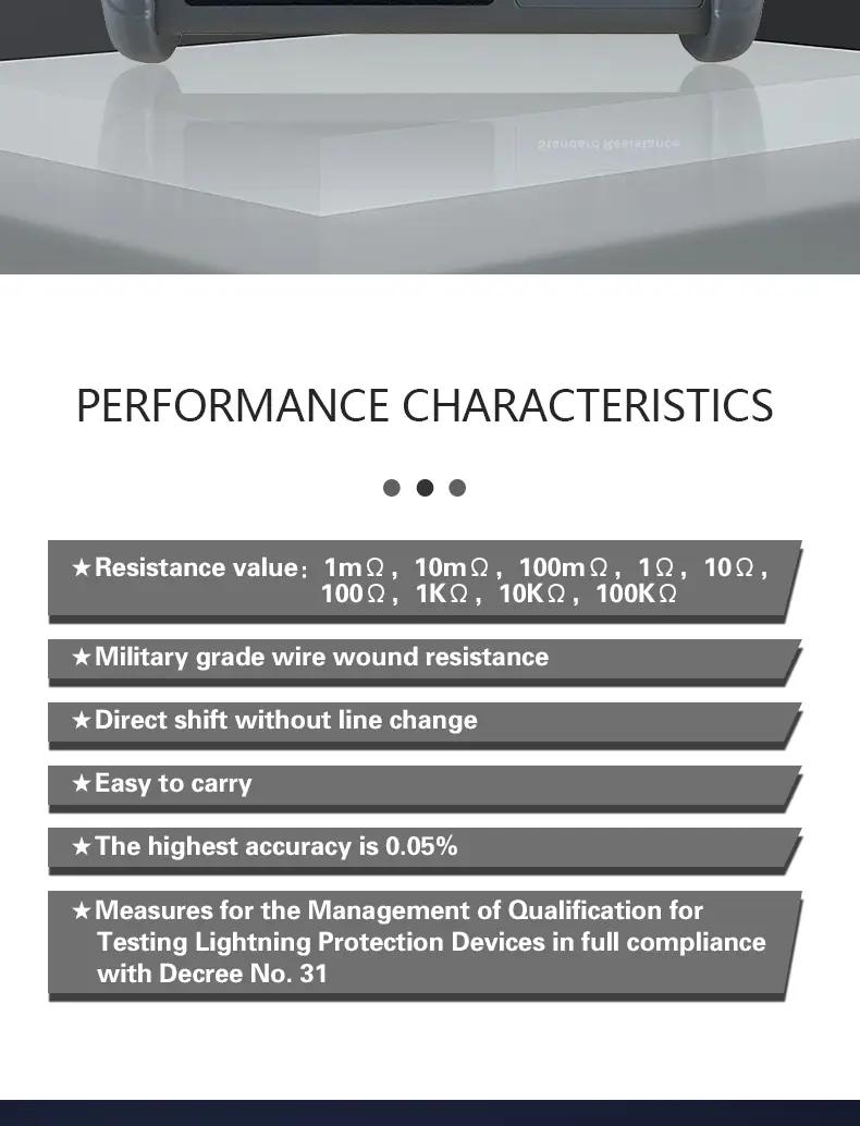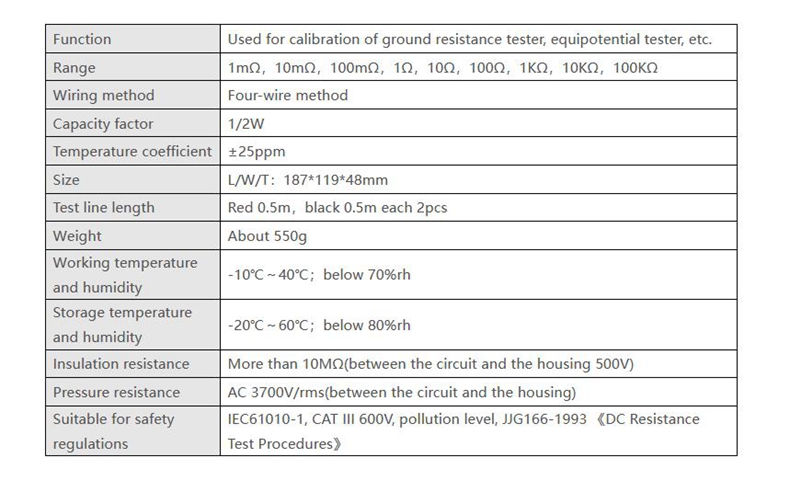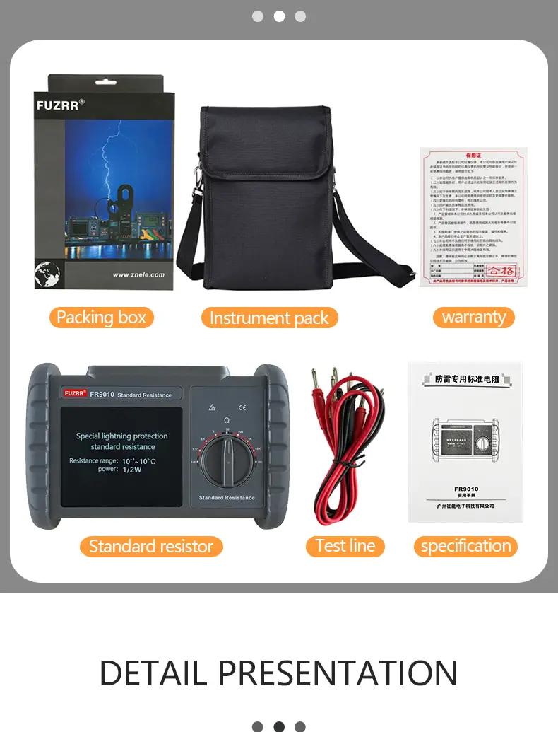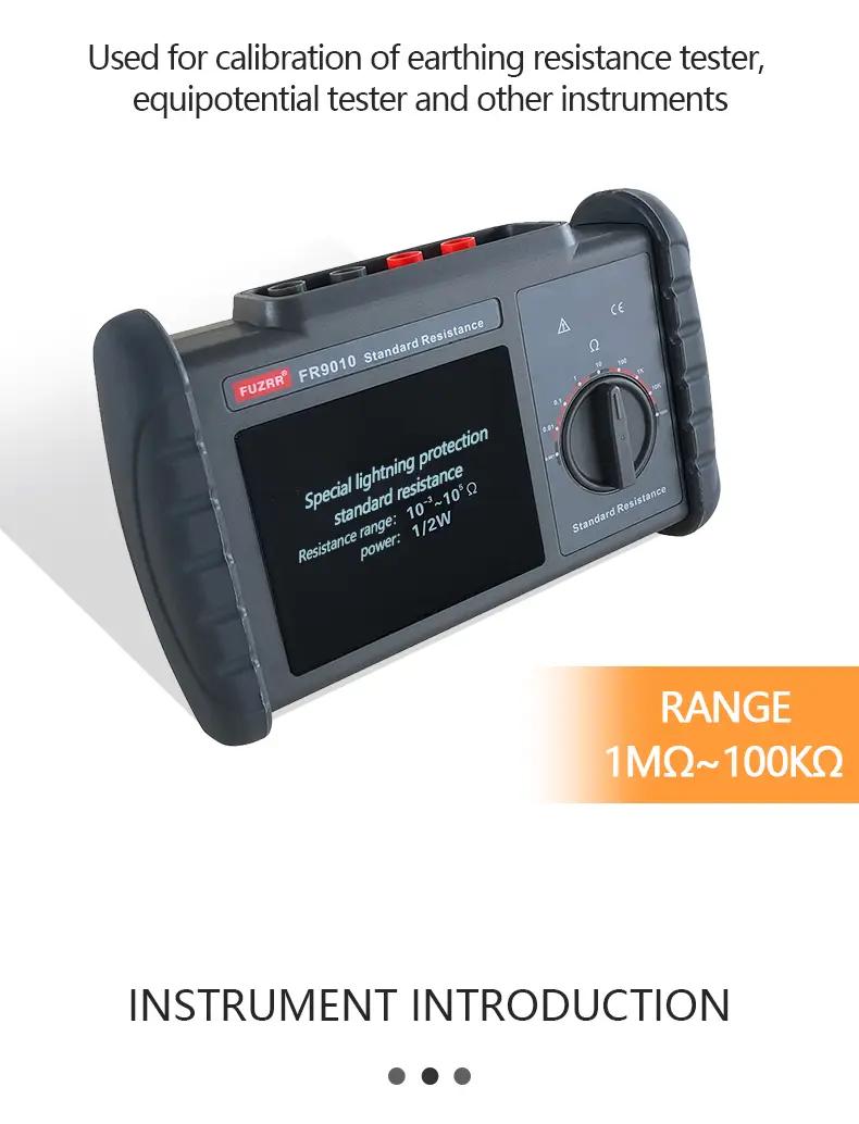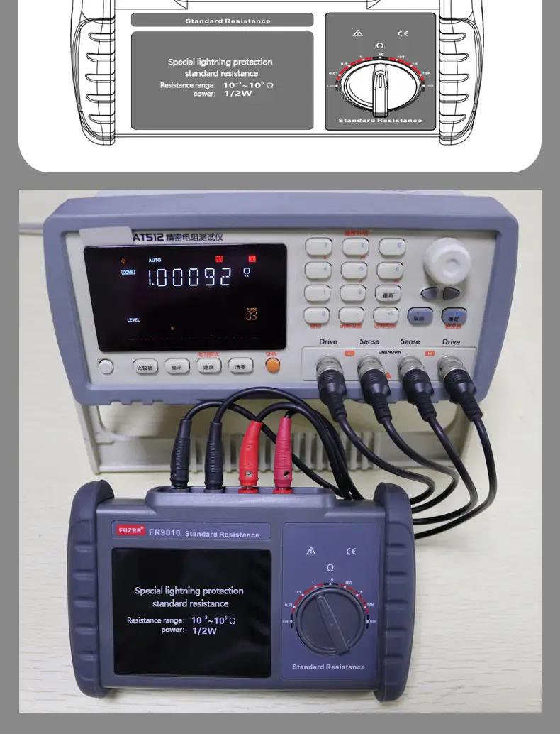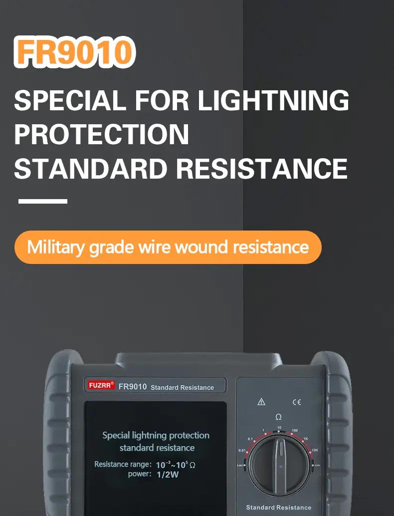 - FR9010 lightning protection special standard resistor consists of 9 1/2W high precision military grade wire wound resistor series. When the instrument is calibrated, there is no need to change the line for direct shifting. The test is convenient, the highest precision is up to 0.05%, and the long-term stability is good. It is a special standard resistor specially designed by our company. Its resistance value includes 1mΩ, 10mΩ, 100mΩ, 1Ω, 10Ω, 100Ω, 1KΩ, 10KΩ, 100KΩ. It fully meets the range of 1mohm~100JKohm as specified in Order No. 31 of the Measures for the Administration of Detecting Qualifications of Lightning Protection Devices. Mainly used for calibration of grounding resistance tester, equipotential tester, etc.
